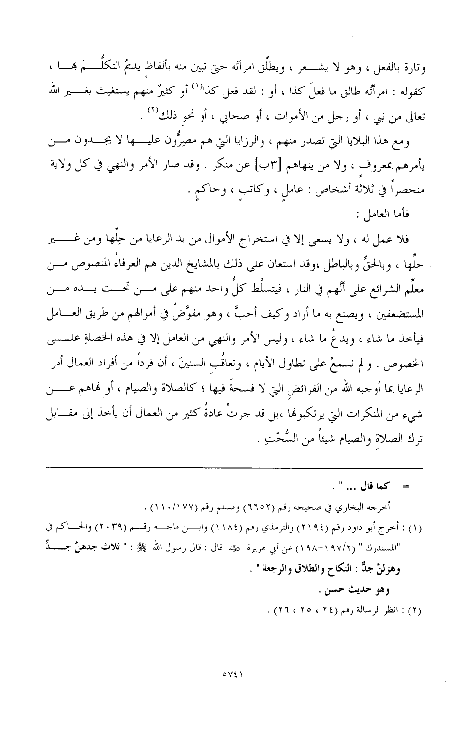 (¬1) أخرج أبو داود رقم (2194) والترمذي رقم (1184) وابن ماجه رقم (2039) والحاكم في "المستدرك" (2/ 197 - 198) عن أبي هريرة رضي الله عنه قال: قال رسول الله صَلَّى اللهُ عَلَيْهِ وَسَلَّمَ: " ثلاث جدهن جد وهزلن جد: النكاح والطلاق والرجعة".