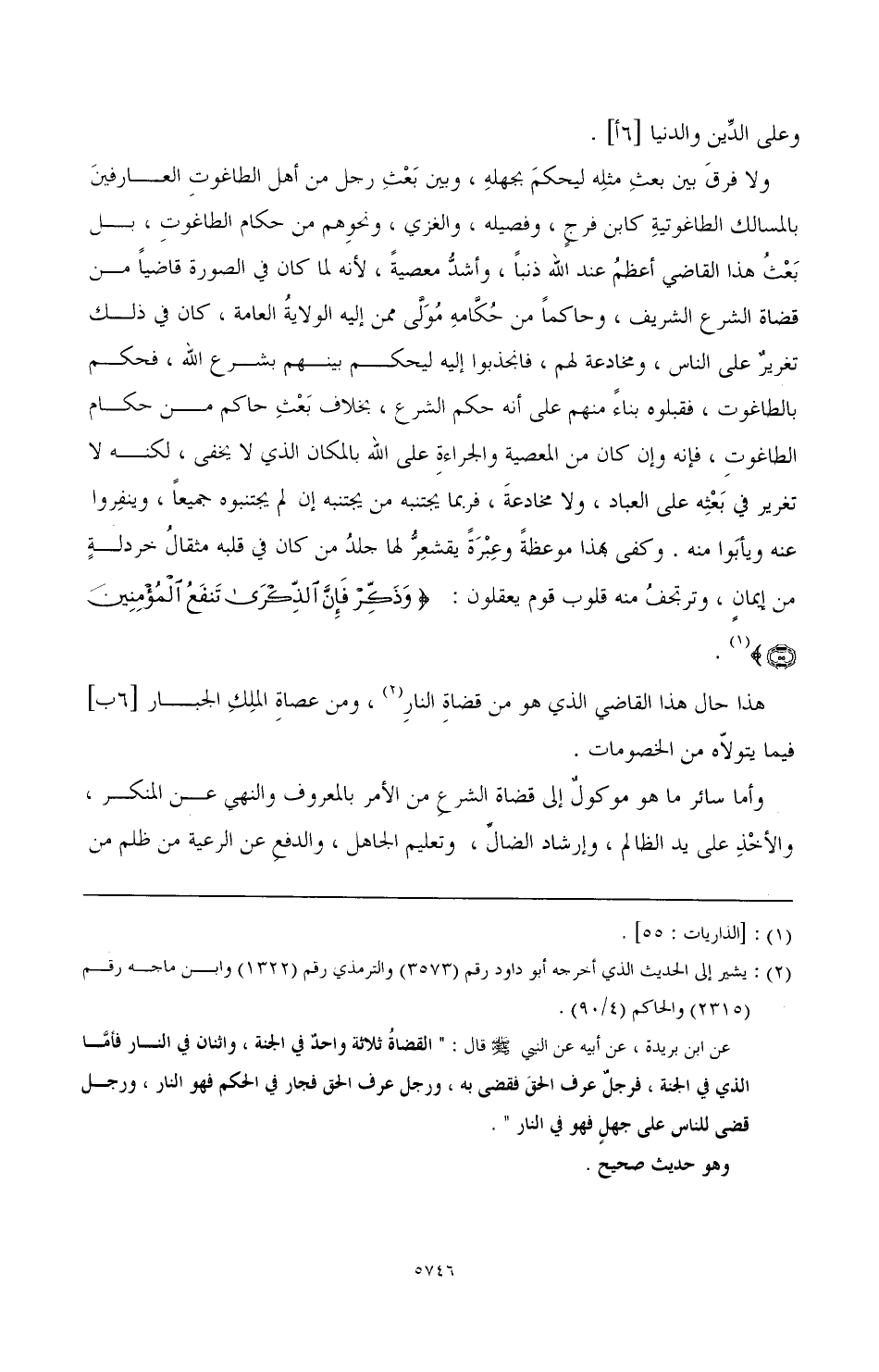 عن ابن بريدة، عن أبيه عن النبي صَلَّى اللهُ عَلَيْهِ وَسَلَّمَ قال: "القضاة ثلاثة واحد في الجنة، واثنان في النار فأما الذي في الجنة، فرجل عرف الحق فقضي به، ورجل عرف الحق فجار في الحكم فهو في النار، ورجل قضى للناس على جهل فهو في النار".
