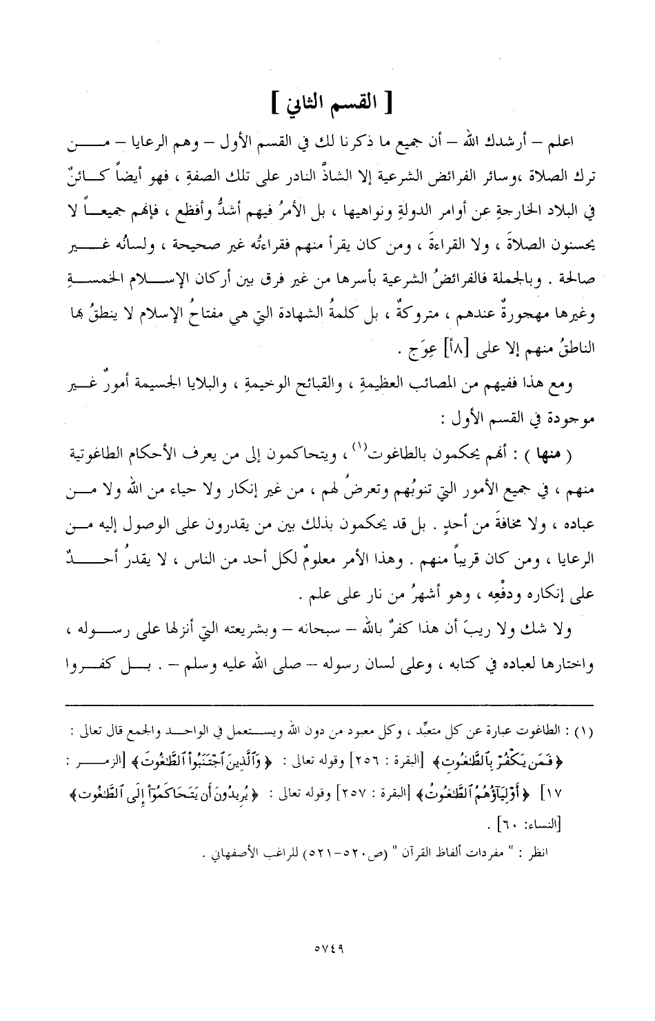 اعلم - أرشدك الله - أن جميع ما ذكرنا لك في القسم الأول - وهم الرعايا - من ترك الصلاة، وسائر الفرائض الشرعية إلا الشاذ النادر على تلك الصفة، فهو أيضًا كائن في البلاد الخارجة عن أوامر الدولة ونواهيها، بل الأمر فيهم أشد وأفظع، فإنهم جميعا لا يحسنون الصلاة، ولا القراءة، ومن كان يقرأ منهم فقراءته غير صحيحة، ولسانه غير صالحة، وبالجملة فالفرائض الشرعية بأسرها من غير فرق بين أركان الإسلام الخمسة وغيرها مهجورة عندهم، متروكة، بل كلمة الشهادة التي هي مفتاح الإسلام لا ينطق بها الناطق منهم إلا على [8أ] عوج.