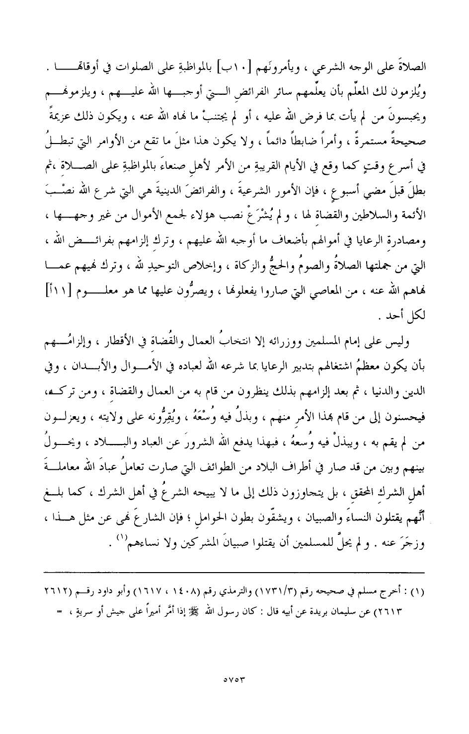 (¬1) أخرجه مسلم في صحيحه رقم (3/ 1731) والترمذي رقم (1408، 1617) وأبو داود رقم (2612، 2613) عن سليمان بريدة عن أبيه قال: كان رسول الله صَلَّى اللهُ عَلَيْهِ وَسَلَّمَ إذا أمر أميرا على جيش أو سرية، أوصاه في خاصة نفسه بتقوى الله، ومن معه من المسلمين خيرا، ثم قال: " اغزوا بسم الله في سبيل الله قاتلوا من كفر بالله واغزوا ولا تغلوا، ولا تغدروا ولا تمثلوا، ولا تقتلوا وليدا. . . ".