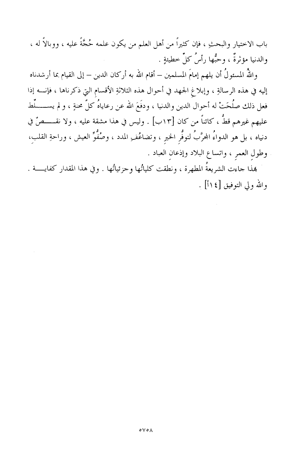 والله المسئول أن يلهم إمام المسلمين - أقام الله به أركان الدين - إلى القيام بما أرشدنا إليه في هذه الرسالة، وإبلاغ الجهد في أحوال هذه الثلاثة الأقسام التي ذكرناها، فإنه إذا فعل ذلك صلحت له أحوال الدين والدنيا، ودفع الله عن رعاياه كل محنة، ولم يسلط عليهم غيرهم قط، كائنا من كان [13 ب]، وليس في هذا مشقة عليه، ولا نقص في دنياه، بل هو الدواء المجرب لتوفر الخير، وتضاعف المدد، وصفو العيش، وراحة القلب، وطول العمر، واتساع البلاد وإذعان العباد.
