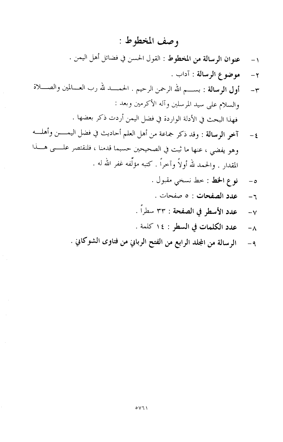4 - آخر الرسالة: وقد ذكر جماعة من أهل العلم أحاديث في فضل اليمن وأهله وهو يفضي، عنها ما ثبت في الصحيحين حسبما قدمنا، فلنقتصر على هذا المقدار، والحمد لله أولا وآخرا، كتبه مؤلفه غفر الله له.