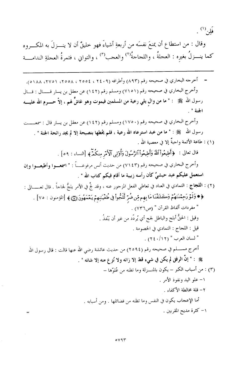 وقال: من استطاع أن يمنع نفسه من أربعة أشياء فهو خليق أن لا ينزل به المكروه كما ينزل بغيره: العجلة، واللجاجة (¬2)، والعجب (¬3) والتواني، فثمرة العجلة الندامة