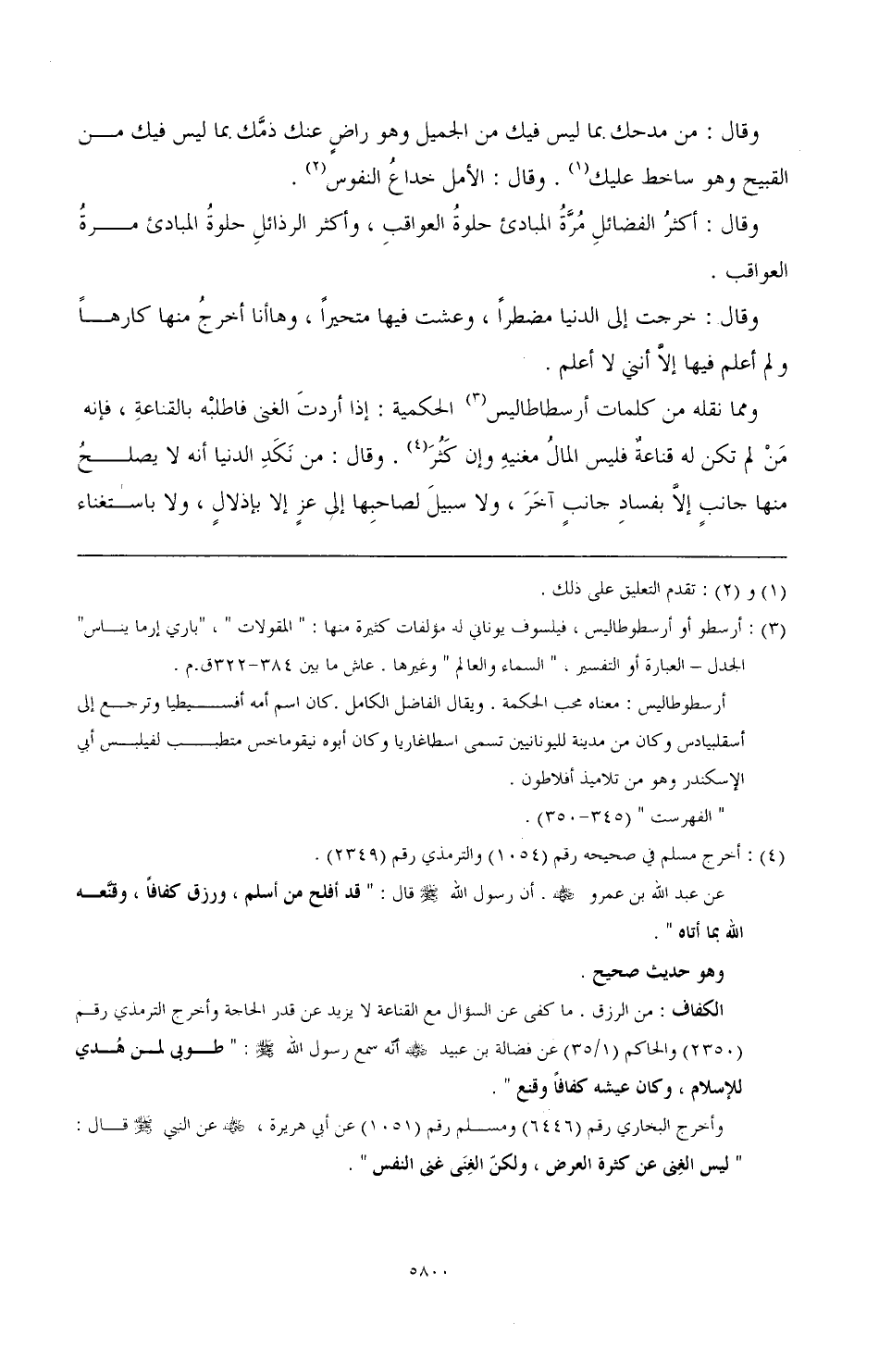 ومما نقله من كلمات أرسطاطاليس (¬3) الحكمية: إذا أردت الغنى فاطلبه بالقناعة، فإنه من لم تكن له قناعة فليس المال مغنيه وإن كثر (¬4). وقال: من نكد الدنيا أنه لا يصلح منها جانب إلا بفساد جانب آخر، ولا سبيل لصاحبها إلى عز إلا بإذلال، ولا باستغناء