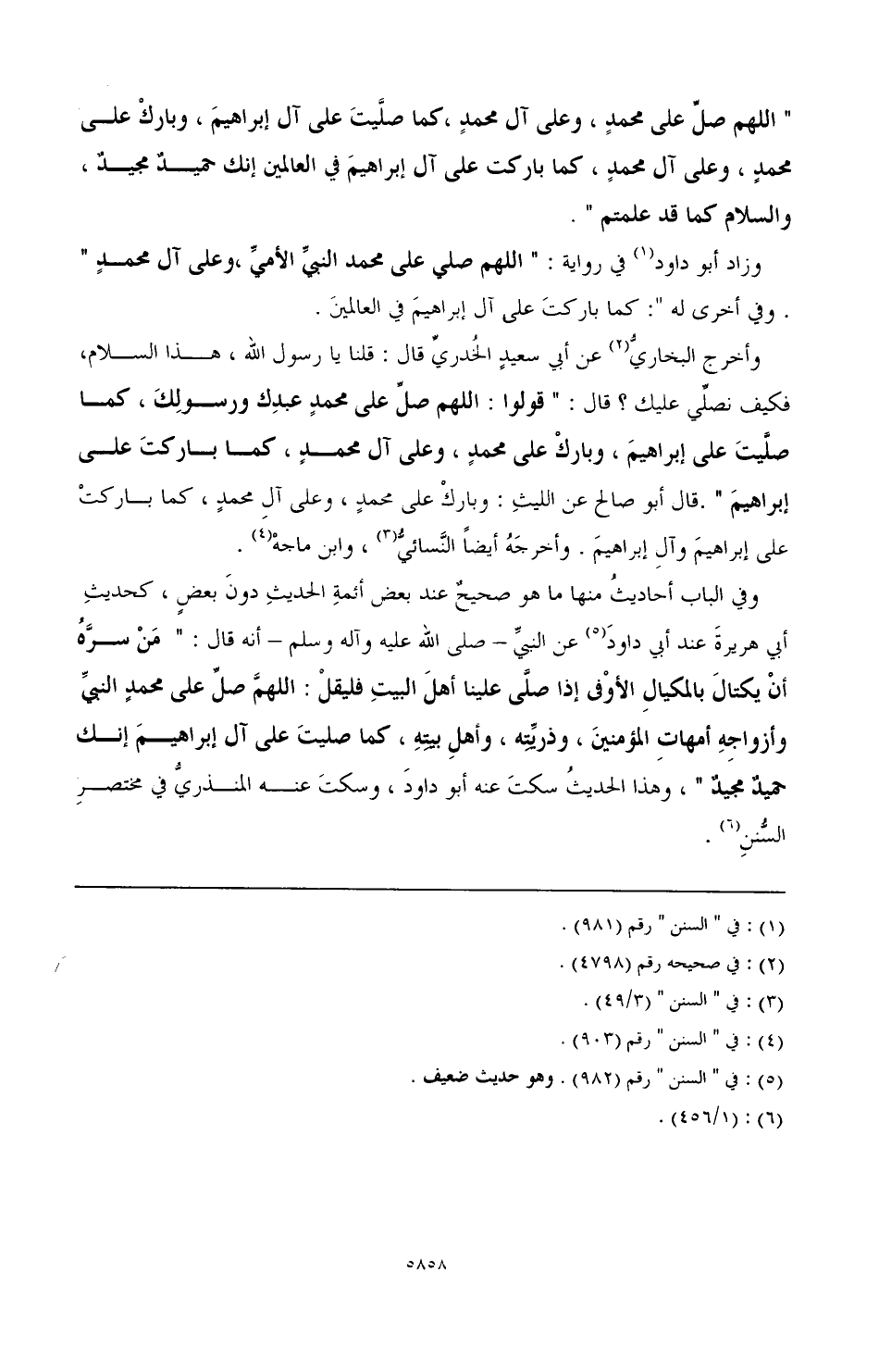 وأخرج البخاريُّ (¬2) عن أبي سعيد الخُدريِّ قال: قلنا يا رسول الله، هذا السلام، فكيف نصلِّى عليك؟ قال: «قولوا: اللهم صلِّ على محمدٍ عبدك ورسولِكَ، كما صلَّيتَ على إبراهيمَ، وباركُ على محمدٍ، وعلى آل محمدٍ، كما باركتَ على إبراهيمَ» قال أبو صالح عن الليثِ: وبارْك على محمدٍ، وعلى آل محمدٍ، كما باركتْ على إبراهيمَ وآلَ إبراهيمَ. وأخرجَهُ أيضًا النسائيُّ، (¬3) وابن ماجهْ. (¬4) وفي الباب أحاديثُ منها ما هو صحيحٌ عند بعض أئمةِ الحديثِ دونَ بعضٍ، كحديث أبي هريرةَ عند أبي داودَ (¬5) عن النبيِّ ـ صلي الله عليه وآله وسلم ـ أنه قال: «مَنْ سرَّهُ أنْ يكتالَ بالمكيالِ الأوْفى إذا صلَّى علينا أهلَ البيتِ فليقلْ: اللهمَّ صلِّ على محمدٍ النبيِّ وأزواجهِ أمهاتِ المؤمنينَ، وذرِّيتِه، وأهلِ بيتهِ، كما صليتَ على آل إبراهيمَ إنك حميدٌ مجيدٌ»، وهذا الحديثُ سكتَ عنه أبو داودَ، وسكتَ عنه المنذريُّ في مختصرِ السُّننِ. (¬6)