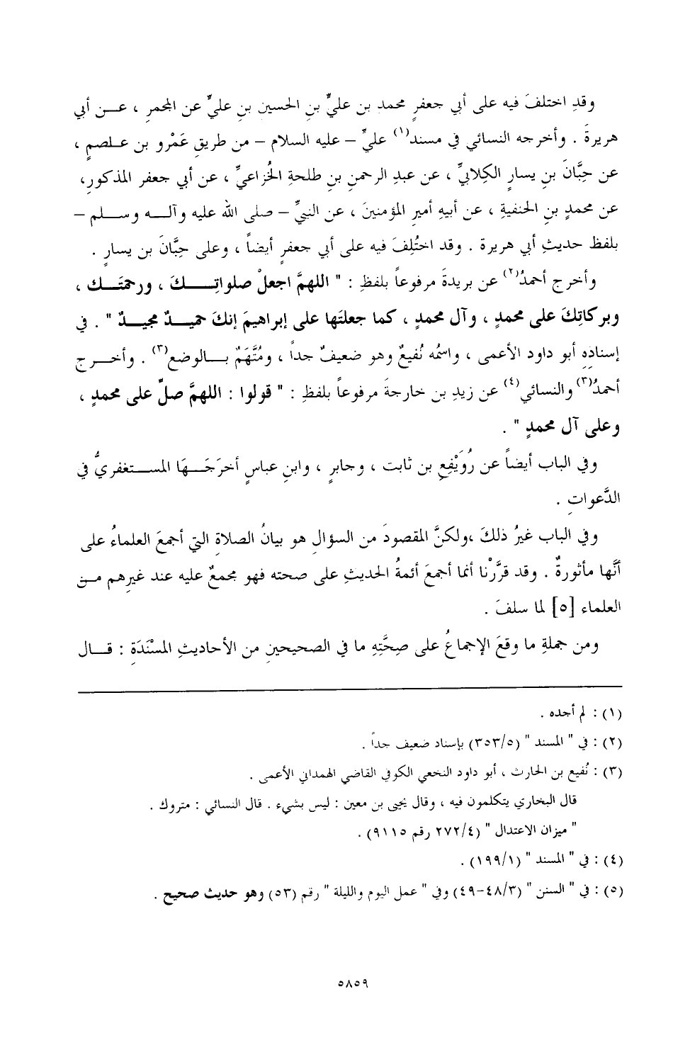 وأخرج أحمدُ (¬2) عن بريدةَ مرفوعًا بلفظِ: «اللهمَّ اجعلْ صلواتِكَ، ورحمتَك، وبركاتِكَ على محمدٍ، وآل محمدٍ، كما جعلتَها على إبراهيمَ إنكَ حميدٌ مجيدٌ». في إسنادِهِ أبو داود الأعمى، واسمُه نُفيعٌ وهو ضعيفٌ جدًّا، ومُتَّهَمٌ بالوضع. (¬3) وأخرج أحمدُ نُفيع بن الحارث، أبو داود النخعي الكوفي القاضي الهمداني الأعمى. قال البخاري يتكلمون فيه، وقال يحيى بن معين: ليس بشيء. قال النسائي: متروك. (ميزان الاعتدال) (4/ 272 رقم 9115). (¬4) في (المسند) (1/ 199). عن زيد بن خارجةَ مرفوعًا بلفظِ: «قولوا: اللهمَّ صلِّ على محمدٍ، وعلى آله محمدٍ».