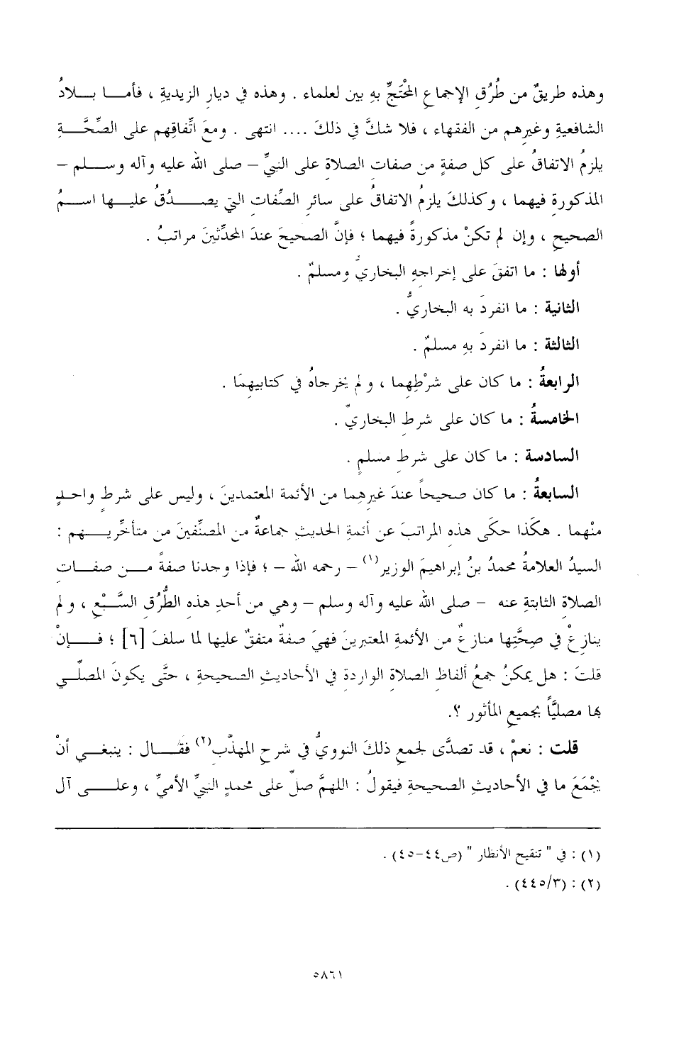 وهذه طريقٌ من طُرُقِ الإجماعِ المحْتَجِّ بهِ بين لعلماء. وهذه في ديارِ الزيديةِ، فأما بلادُ الشافعيةِ وغيرِهم من الفقهاء، فلا شكَّ في ذلكَ ... انتهى. ومعَ اتِّفاقِهم على الصِّحَّةِ يلزمُ الاتفاقُ على كل صفةٍ من صفات الصلاةِ على النبيِّ ـ صلي الله عليه وآله وسلم ـ المذكورةِ فيهما، وكذلكَ يلزمُ الاتفاقُ على سائر الصِّفاتِ التي يصدُقُ عليها اسمُ الصحيحِ، وإن لم تكنْ مذكورةً فيهما؛ فإنَّ الصحيحَ عندَ المحدِّثينَ مراتبُ.