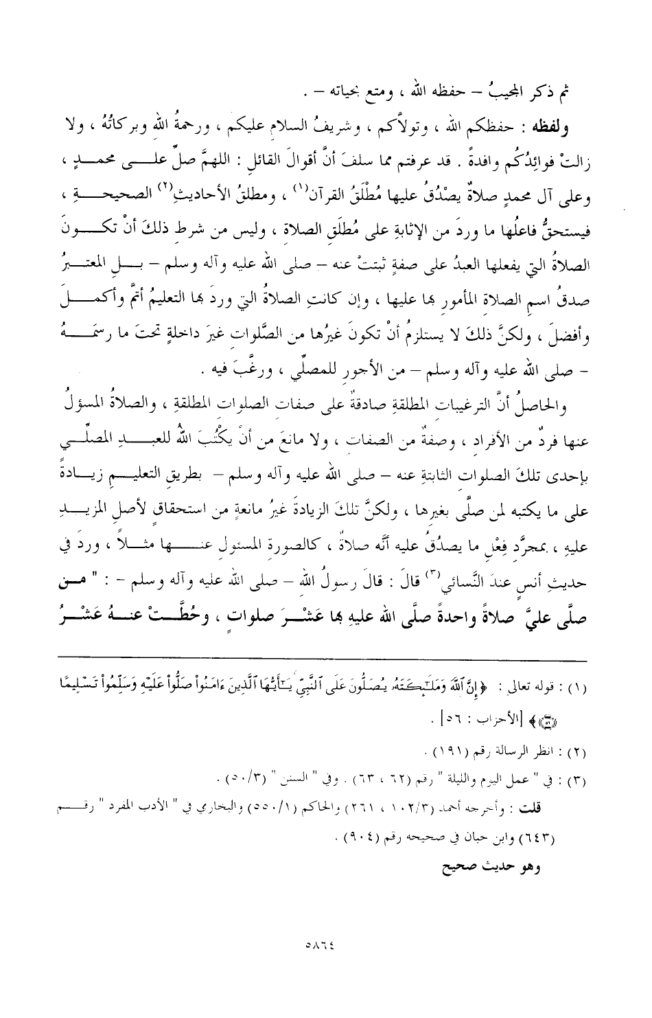 والحاصلُ أن الترغيباتِ المطلقةِ صادقةٌ على صفاتِ الصلواتِ المطلقةِ، والصلاةُ المسئولُ عنها فردٌ من الأفرادِ، وصفةٌ من الصفاتِ، ولا مانعَ من أنْ يكْتُبَ اللهُ للعبدِ المصلِّي بإحدى تلكَ الصلواتِ الثابتةِ عنه ـ صلي الله عليه وآله وسلم ـ بطريقِ التعليمِ زيادة على ما يكتبه لمن صلَّى بغيرِها، ولكنَّ تلك الزيادةَ غيرُ مانعةٍ من استحقاقٍ لأصلِ المزيدِ عليهِ، بمجرَّدِ فِعْلِ ما يصدُقُ عليه أنَّه صلاةٌ، كالصورةِ المسئولِ عنها مثلاً، وردَ في حديثِ أنسٍ عندَ النَّسائي (¬3) قالَ: قالَ رسولُ اللهِ ـ صلي الله عليه وآله وسلم ـ: «من صلَّى عليَّ صلاةً واحدةً صلَّى الله عليهِ بها عَشْرَ صلواتٍ، وحُطَّتْ عنهُ عَشْرُ
