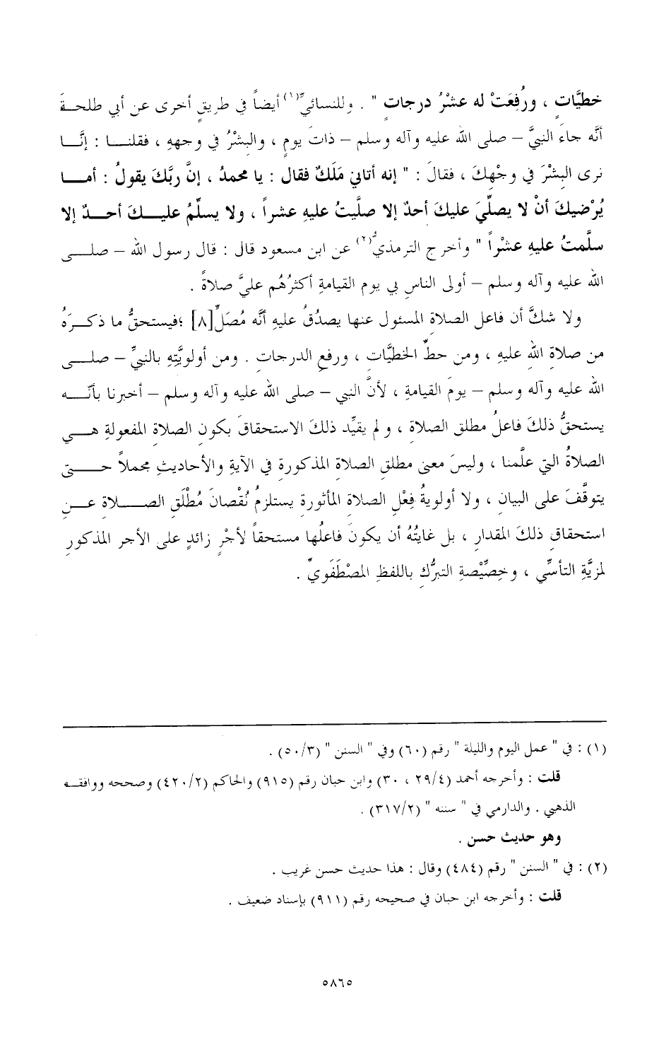 ولا شكَّ أن فاعل الصلاةِ المسئول عنها يصدُقُ عليهِ أنَّه مُصَلٍّ [8]؛ فيستحقُّ ما ذكرَهُ من صلاةِ اللهِ عليه، ومن حطِّ الخطيَّاتِ، ورفعِ الدرجاتِ، ومن أولويَّتِه بالنبيَّ ـ صلي الله عليه وآله وسلم ـ يومَ القيامةِ، لأنَّ النبي ـ صلي الله عليه وآله وسلم ـ أخبرنا بأنَّه يستحقُّ ذلكَ فاعلُ مطلق الصلاةِ، ولم يقيَّد ذلكَ الاستحقاقَ بكونِ الصلاةِ المفعولةِ هي الصلاةُ التي علَّمنا، وليسَ معنى مطلقِ الصلاةِ المذكورة في الآيةِ والأحاديثِ مجملاً حتى يتوقَّفَ على البيانِ، ولا أولويةُ فِعْلِ الصلاةِ المأثورةِِ يستلزمُ نُقْصاَ مُطْلَقِ الصلاةِ عن استحقاقِ ذلكَ المقدارِ، بل غايتُهُ أن يكونَ فاعِلُها مستحقًا لأجْرٍ زائدٍ على الأجر المذكورِ لمزيَّةِ التأسِّى، وخِصَّيْصةِ التبرُّكِ باللفظ المصْطَفَويَّ.