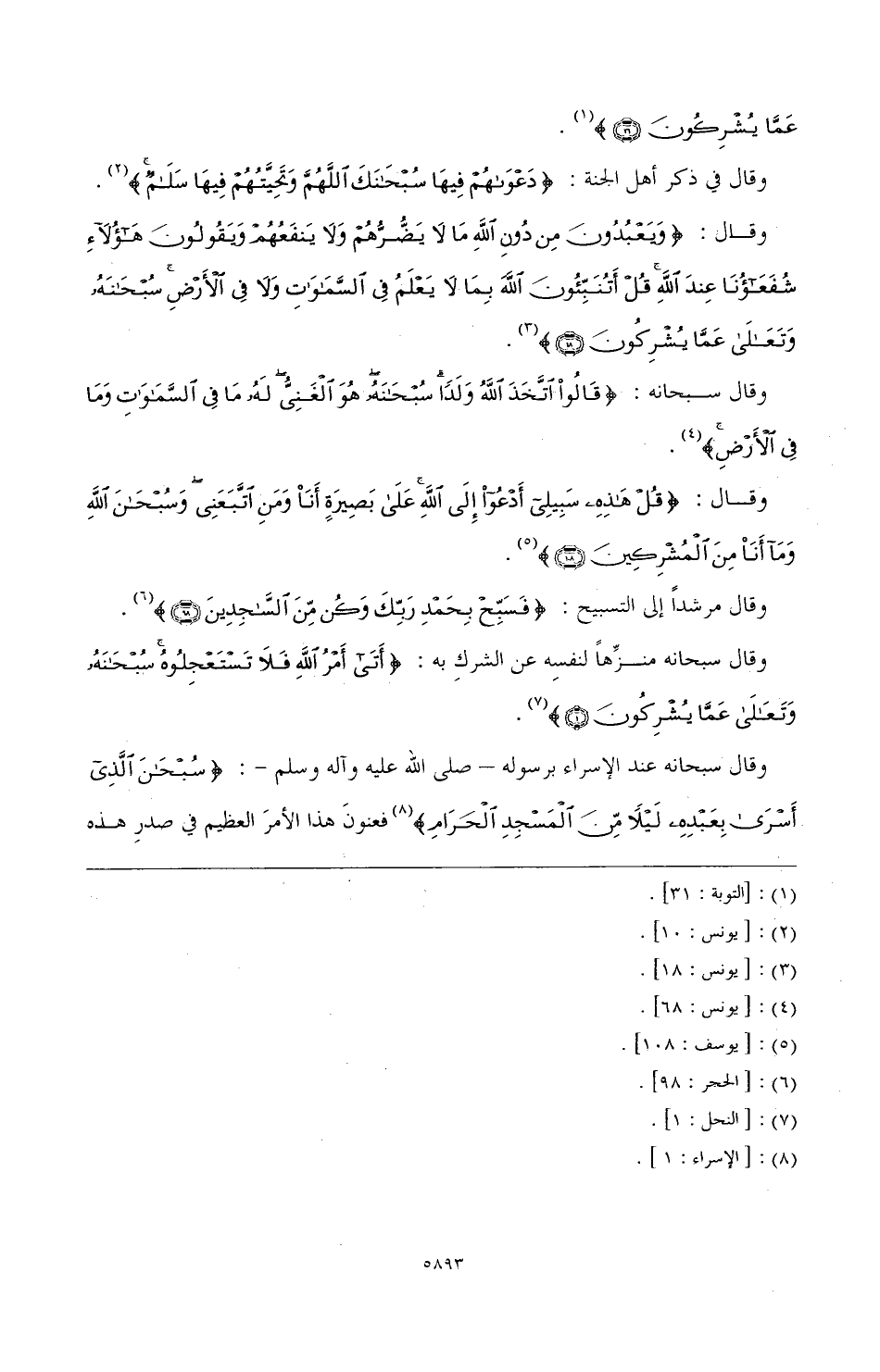وقال في ذكر أهل الجنة: {دَعْوَاهُمْ فِيهَا سُبْحَانَكَ اللَّهُمَّ وَتَحِيَّتُهُمْ فِيهَا سَلَامٌ} (¬2) وقال: {وَيَعْبُدُونَ مِنْ دُونِ اللَّهِ مَا لَا يَضُرُّهُمْ وَلَا يَنْفَعُهُمْ وَيَقُولُونَ هَؤُلَاءِ شُفَعَاؤُنَا عِنْدَ اللَّهِ قُلْ أَتُنَبِّئُونَ اللَّهَ بِمَا لَا يَعْلَمُ فِي السَّمَاوَاتِ وَلَا فِي الْأَرْضِ سُبْحَانَهُ وَتَعَالَى عَمَّا يُشْرِكُونَ} (¬3)