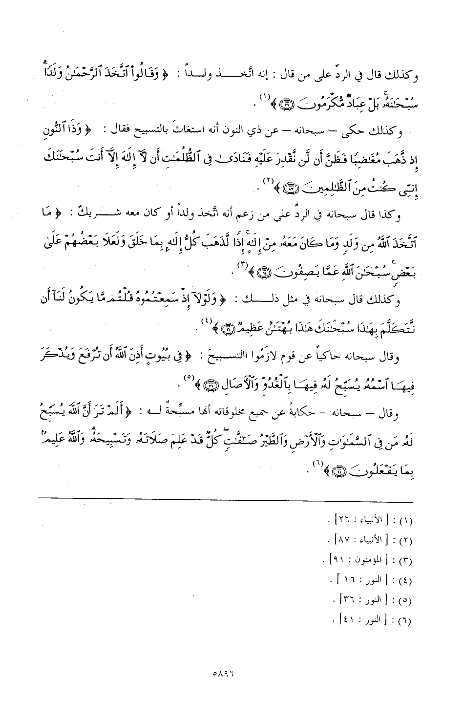 وقال ـ سبحانه ـ حكايةً عن جميع مخلوقاته أنها مسبِّحةٌ له: {أَلَمْ تَرَ أَنَّ اللَّهَ يُسَبِّحُ لَهُ مَنْ فِي السَّمَاوَاتِ وَالْأَرْضِ وَالطَّيْرُ صَافَّاتٍ كُلٌّ قَدْ عَلِمَ صَلَاتَهُ وَتَسْبِيحَهُ وَاللَّهُ عَلِيمٌ بِمَا يَفْعَلُونَ} (¬6)