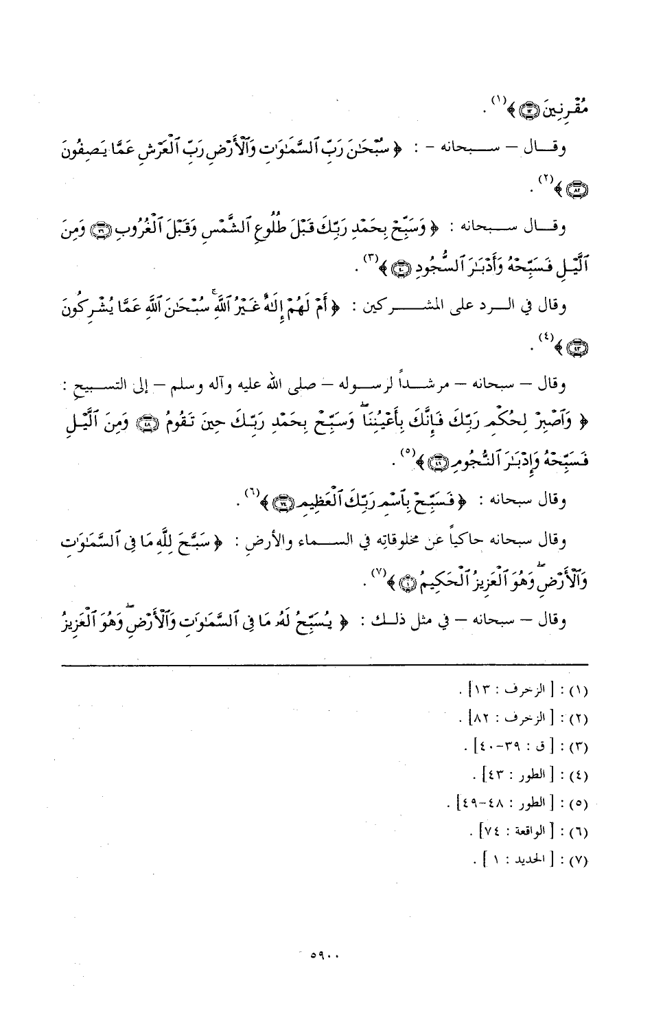 وقال سبحانه: {وَسَبِّحْ بِحَمْدِ رَبِّكَ قَبْلَ طُلُوعِ الشَّمْسِ وَقَبْلَ الْغُرُوبِ (39) وَمِنَ اللَّيْلِ فَسَبِّحْهُ وَأَدْبَارَ السُّجُودِ (40)} (¬3). وقال في الرد على المشركين: {أَمْ لَهُمْ إِلَهٌ غَيْرُ اللَّهِ سُبْحَانَ اللَّهِ عَمَّا يُشْرِكُونَ} (¬4).