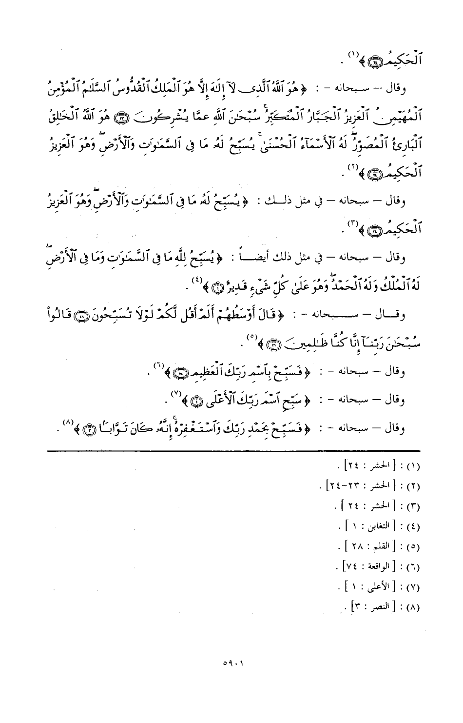 وقال - سبحانه -: {(هُوَ اللَّهُ الَّذِي لَا إِلَهَ إِلَّا هُوَ الْمَلِكُ الْقُدُّوسُ السَّلَامُ الْمُؤْمِنُ الْمُهَيْمِنُ الْعَزِيزُ الْجَبَّارُ الْمُتَكَبِّرُ سُبْحَانَ اللَّهِ عَمَّا يُشْرِكُونَ) (هُوَ اللَّهُ الْخَالِقُ الْبَارِئُ الْمُصَوِّرُ لَهُ الْأَسْمَاءُ الْحُسْنَى يُسَبِّحُ لَهُ مَا فِي السَّمَاوَاتِ وَالْأَرْضِ وَهُوَ الْعَزِيزُ الْحَكِيمُ)} (¬2). وقال - سبحانه - في مثل ذلك: {يُسَبِّحُ لَهُ مَا فِي السَّمَاوَاتِ وَالْأَرْضِ وَهُوَ الْعَزِيزُ الْحَكِيمُ} (¬3).