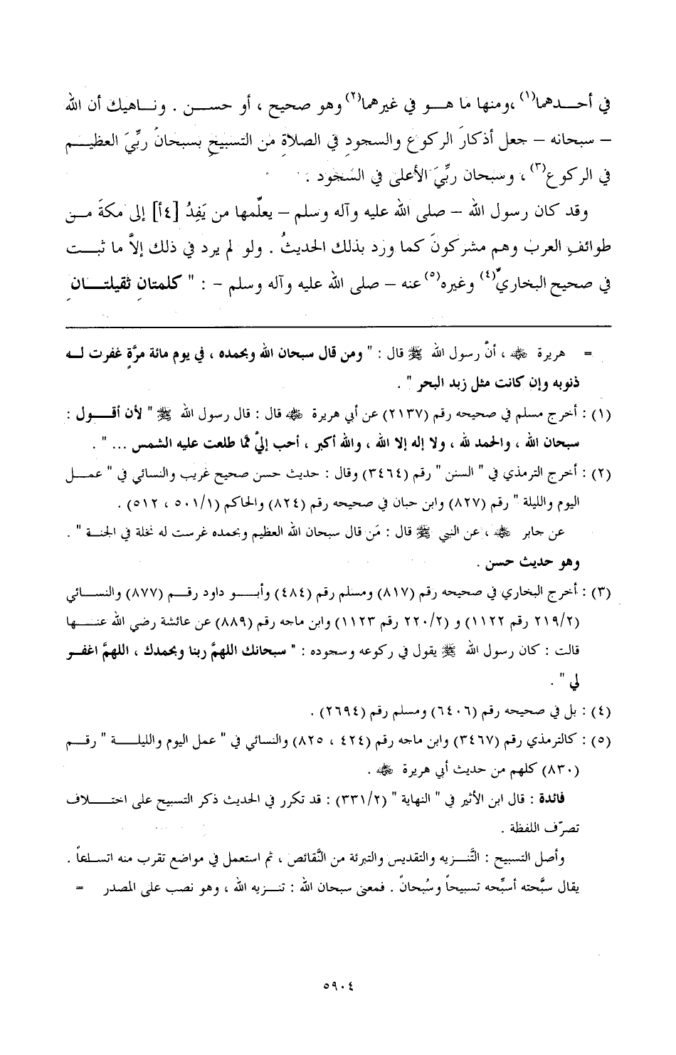 في أحدهما، (¬1) ومنها ما هو في غيرهما (¬2) وهو صحيح، أو حسن، وناهيك أن الله ـ سبحانه ـ جعل أذكارَ الركوع والسجودِ في الصلاة من التسبيحِ بسبحانَ ربِّيَ العظيم في الركوع، (¬3)، وسبحان ربِّيَ الأعلى في السجود.