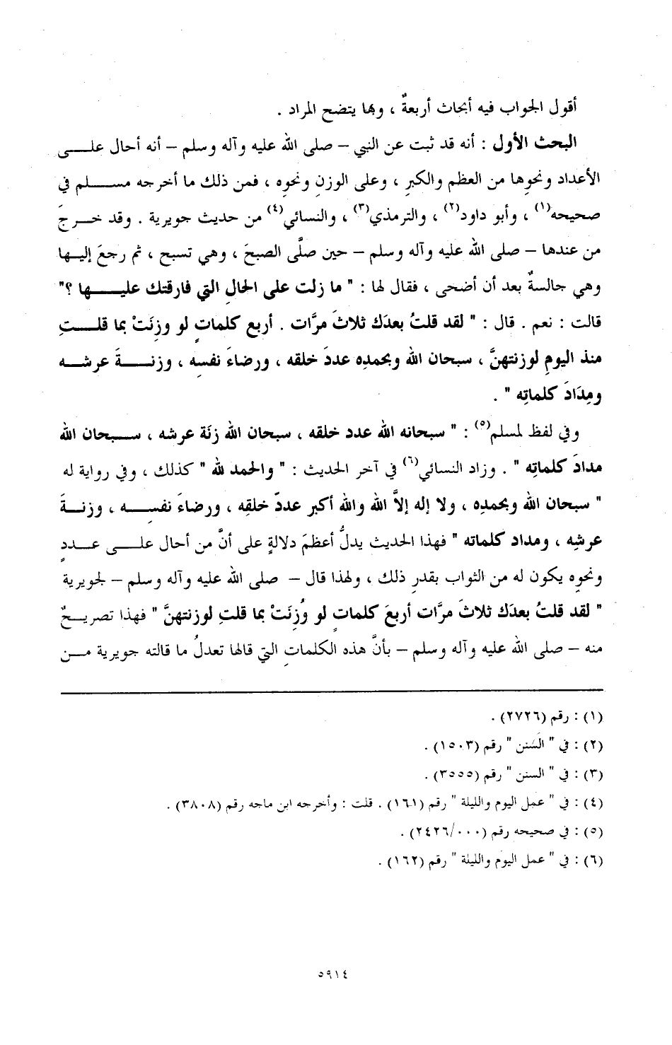 البحث الأول: أنه قد ثبت عن النبي ـ صلي الله عليه وآله وسلم ـ أنه أحال على الأعداد ونحوِِها من العظم والكبرِ، وعلى الوزنِ ونحوِه، فمن ذلك ما أخرجه مسلم في صحيحه، (¬1) وأبو داود، (¬2) والترمذي، (¬3) والنسائي (¬4) من حديث جويرية. وقد خرجَ من عندها ـ صلي الله عليه وآله وسلم ـ حين صلَّى الصبحَ، وهي تسبح، ثم رجعَ إليها وهي جالسةٌ بعد أن أضحى، فقال لها: «ما زلت على الحالِ التِي فارقتك عليها؟» قالت: نعم. قال: «لقد قلتُ بعدَك ثلاثَ مرَّات. أربع كلماتٍ لو وزِنَتْ بما قلتِ منذ اليوم لوزنتهنَّ، سبحان الله وبحمدِه عددَ خلقه، ورضاءَ نفسِه، وزنةَ عرشه ومِدَادَ كلماتِه».