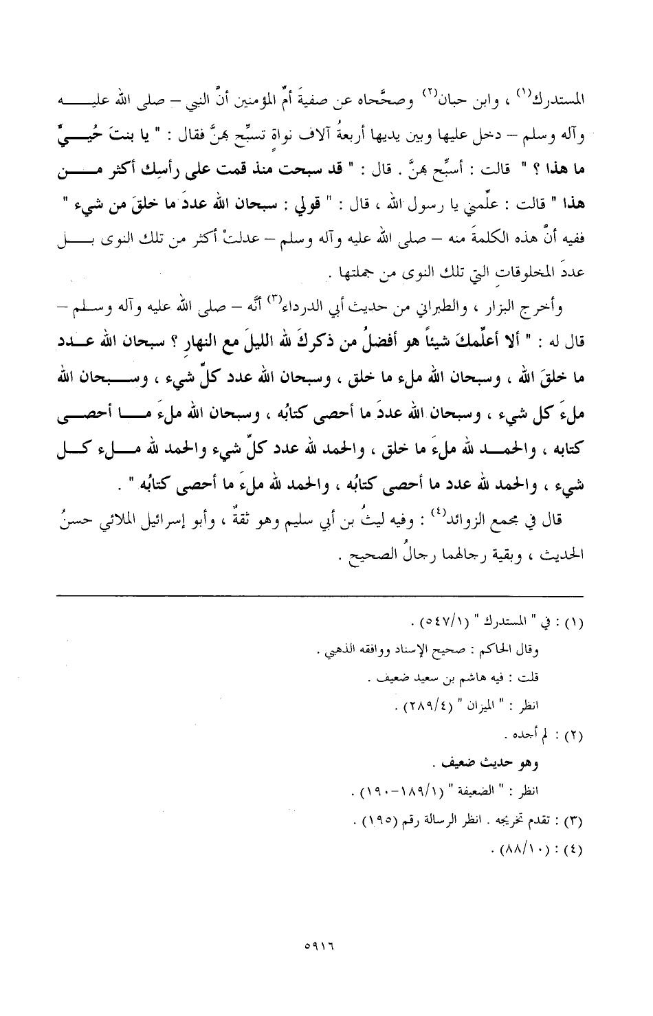 المستدرك، (¬1) وابن حبان (¬2) وصحَّحاه عن صفيةَ أمِّ المؤمنين أنَّ النبي ـ صلي الله عليه وآله وسلم ـ دخل عليها وبين يديها أربعةُ آلاف نواةٍ تسبِّح بهنَّ فقال: «يا بنتَ حُييِّ ما هذا؟» قالت: أسبِّح بهنَّ. قال: «قد سبحت منذ قمت على رأسكِ أكثر من هذا» قالت: علِّمني يا رسول الله، قال: «قولي: سبحان الله عددَ ما خلقَ من شيء» ففيه أنَّ هذه الكلمةَ منه ـ صلي الله عليه وآله وسلم ـ عدلتْ أكثر من تلك النوى بل عددَ المخلوقاتِ التي تلك النوى من جملتها.