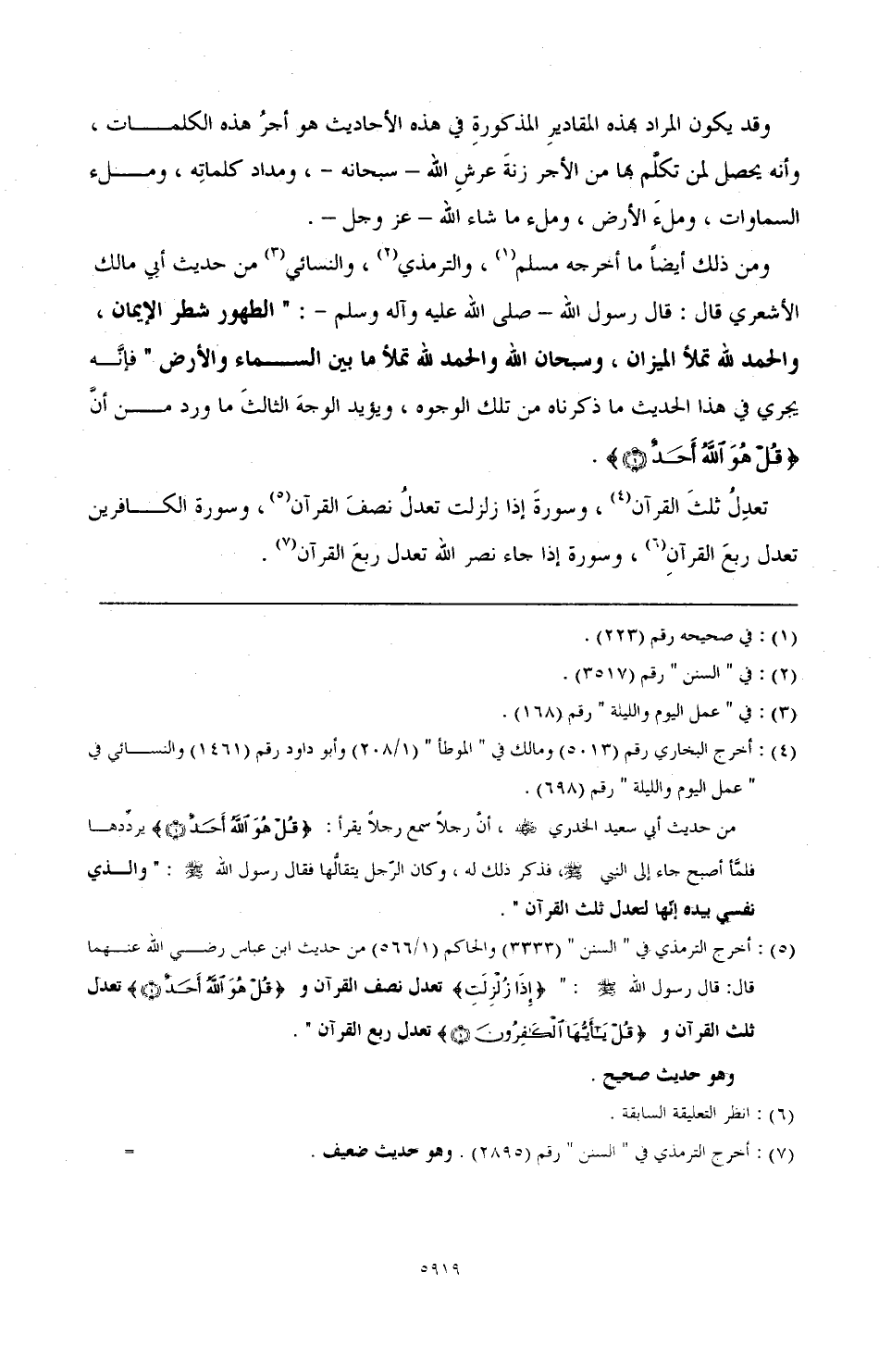 (¬5) أخرج الترمذي في (السنن) (3333)، والحاكم (1/ 566) من حديث ابن عباس رضي الله عنهما قال: قال رسول الله صلي الله عليه وسلم: «{إِذَا زُلْزِلَتِ} تعدل نصف القرآن، و {(قُلْ هُوَ اللَّهُ أَحَدٌ)} تعدل ثلث القرآن، و {(قُلْ يَا أَيُّهَا الْكَافِرُونَ)} تعدل ربع القرآن».