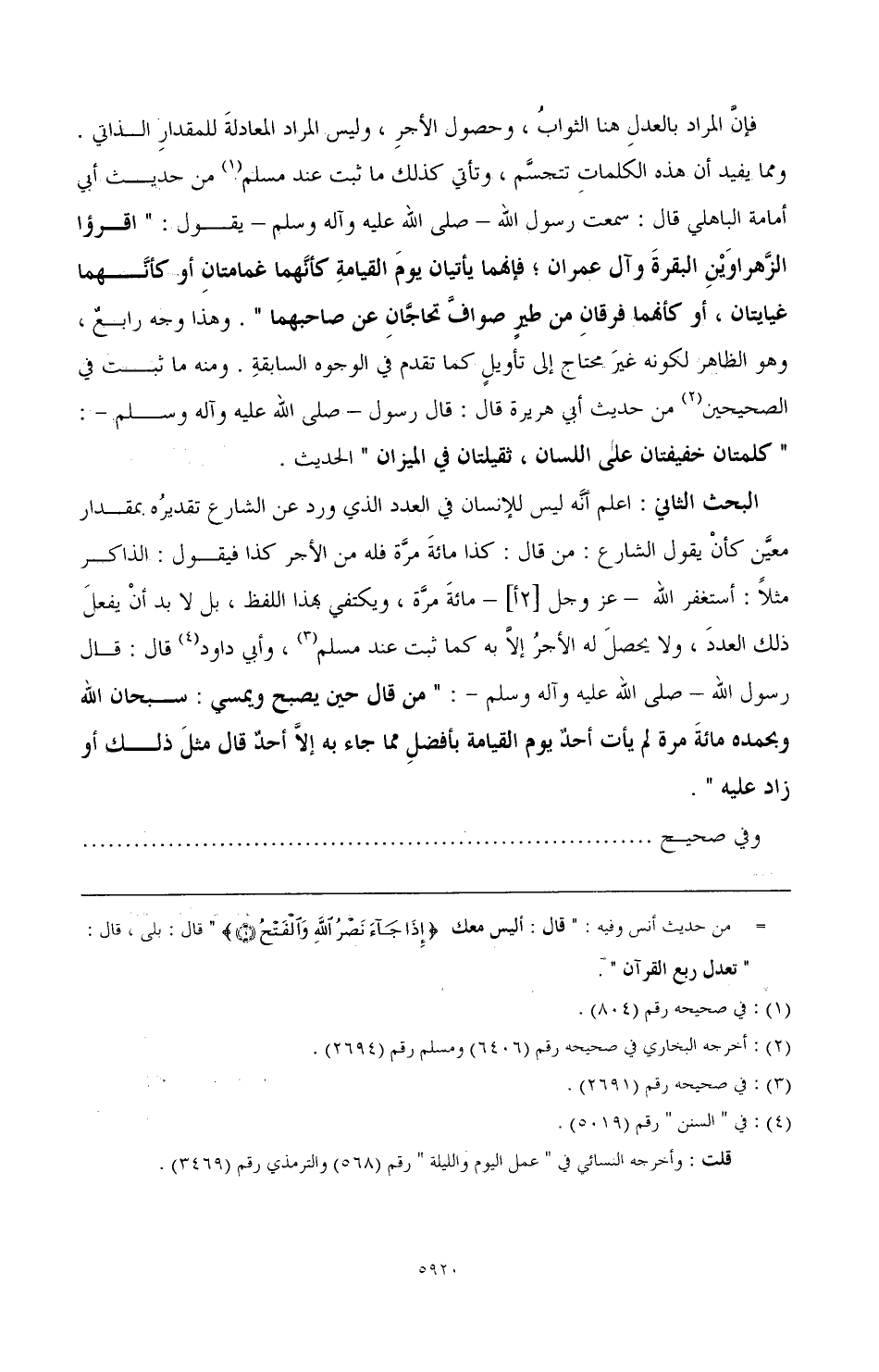 البحث الثاني: اعلم أنَّه ليس للإنسان في العدد الذي ورد عن الشارع تقديرُه بمقدار معيَّن كأنْ يقول الشارع: من قال: كذا مائةَ مرَّة فله من الأجر كذا فيقول: الذاكر مثلاً: أستغفر الله ـ عز وجل [2أ]ـ مائةَ مرَّة، ويكتفي بهذا اللفظ، بل لا بد أنْ يفعلَ ذلك العددَ، ولا يحصلَ له الأجرُ إلاَّ به كما ثبت عند مسلم، (¬3) وأبي داود (¬4) قال: قال رسول الله ـ صلي الله عليه وآله وسلم ـ: «من قال حين يصبح ويمسي: سبحان الله وبحمده مائةَ مرة لم يأت أحدٌ يوم القيامة بأفضلِ مما جاء به إلاَّ أحدٌ قال مثلَ ذلك أو زاد عليه».