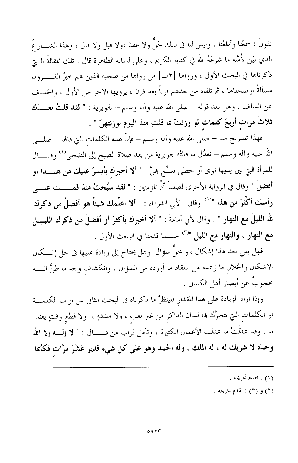 نقولَ: سمعْنا وأطعْنا، وليس لنا في ذلك حَلٌّ ولا عقدٌ، ولا قيل ولا قالَ، وهذا الشارعُ الذي بيَّن لأُمَّته ما شرعَهُ الله في كتابه الكريم، وعلى لسانه الطاهرة قال: تلك المقالةَ التي ذكرناها في البحث الأول، ورواها [2ب] من رواها من صحبه الذين هم خيرُ القرون مسألةً أوضحناها، ثم تلقاه من بعدهم قرنًا بعد قرن، يرويها الآخر عن الأول، والخلف عن السلف. وهل بعد قوله ـ صلي الله عليه وآله وسلم ـ لجويرية: «لقد قلتُ بعدَك ثلاثَ مرات أربعَ كلماتٍ لو وزنتْ بما قلتِ منذ اليومِ لوزنتهنّ».