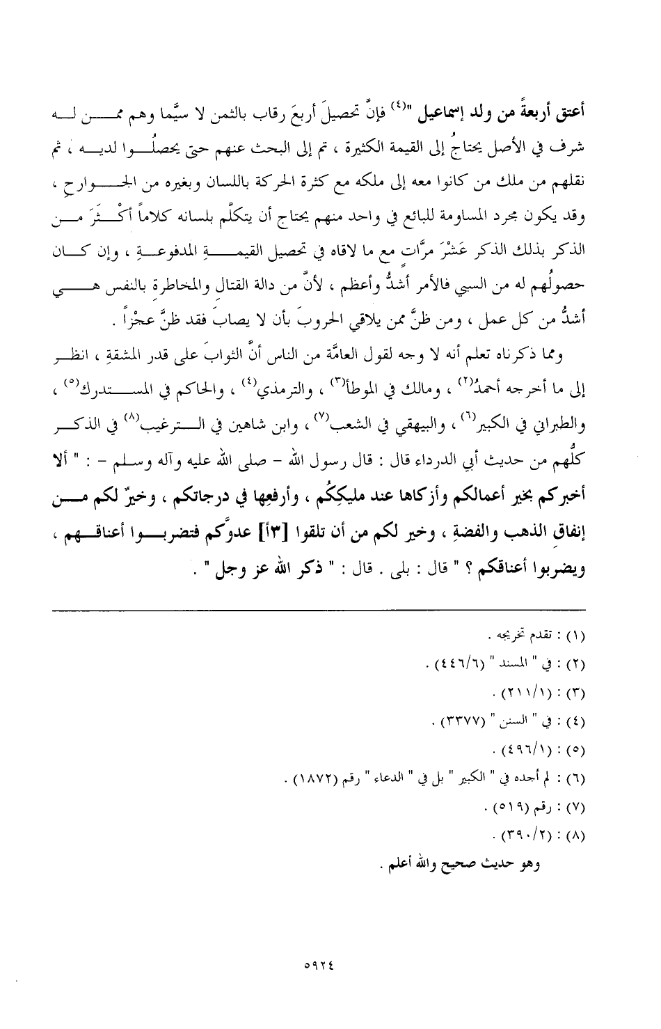 ومما ذكرناه تعلم أنه لا وجه لقول العامَّة من الناس أنَّ الثوابَ على قدر المشقةِ، انظر إلى ما أخرجه أحمدُ، (¬2) ومالك في الموطأ، (¬3) والترمذي، (¬4) والحاكم في المستدرك، (¬5) والطبراني في الكبير، (¬6) والبيهقي في الشعب، (¬7) وابن شاهين في الترغيب (¬8) في الذكر كلُّهم من حديث أبي الدرداء قال: قال رسول الله ـ صلي الله عليه وآله وسلم ـ: «ألا أخبركم بخير أعمالكم وأزكاها عند مليكِكُم، وأرفِعها في درجاتكم، وخيرٌ لكم من إنفاقِ الذهب والفضةِ، وخير لكم من أن تلقوا [3أ] عدوَّكم فتضربوا أعناقهم، ويضربوا أعناقكم؟» قال: بلى. قال: «ذكر الله عز وجل».