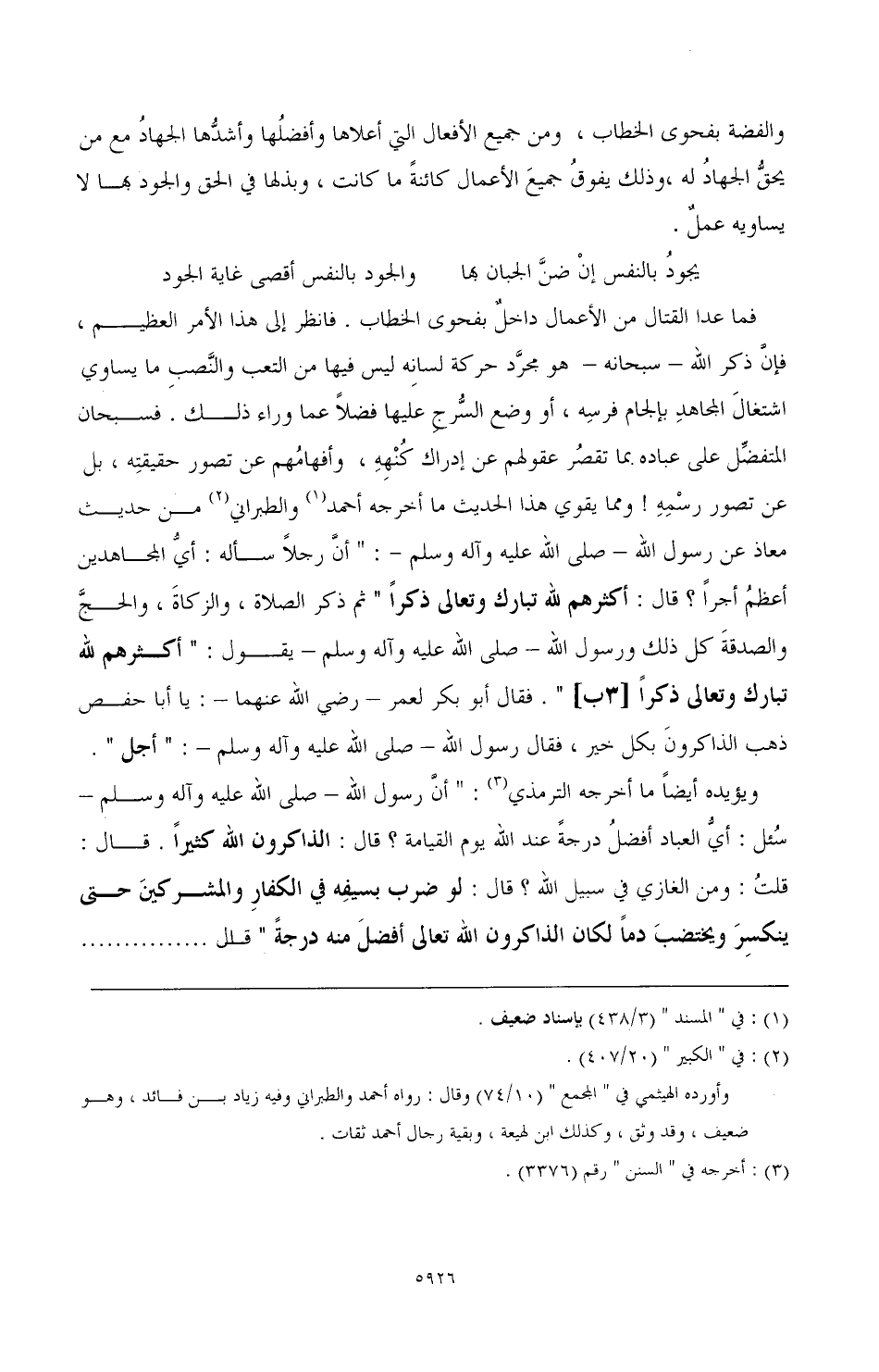 فما عدا القتال من الأعمال داخلٌ بفحوى الخطاب. فانظر إلى هذا الأمر العظيم، فإنَّ ذكر الله ـ سبحانه ـ هو مجرَّد حركة لسانِه ليس فيها من التعب والنَّصبِ ما يساوي اشتغالَ المجاهدِ بإلجام فرسِه، أو وضع السُّّرجِ عليها فضلاً عما وراء ذلك، فسبحانه المتفضِّل على عباده بما تقصُر عقولهم عن إدراك كُنْهِهِ، وأفهامُهم عن تصور حقيقتهِ، بل عن تصور رسْمِهِ! ومما يقوي هذا الحديث ما أخرجه أحمد (¬1) والطبراني (¬2) من حديث معاذ عن رسول الله ـ صلي الله عليه وآله وسلم ـ: أنَّ رجلاً سأله: أيُّ المجاهدين أعظمُ أجرًا؟ قال: «أكثرهم لله تبارك وتعالى ذكرًا» ثم ذكر الصلاة، والزكاةَ، والحجَّ والصدقةَ كل ذلك ورسول الله ـ صلي الله عليه وآله وسلم ـ يقول: «أكثرهم لله تبارك وتعالى ذكرًا [3ب]». فقال ابو بكر لعمر ـ رضي الله عنهما ـ: يا أبا حفص ذهب الذاكرونَ بكل خير، فقال رسول الله ـ صلي الله عليه وآله وسلم ـ: «أجل».
