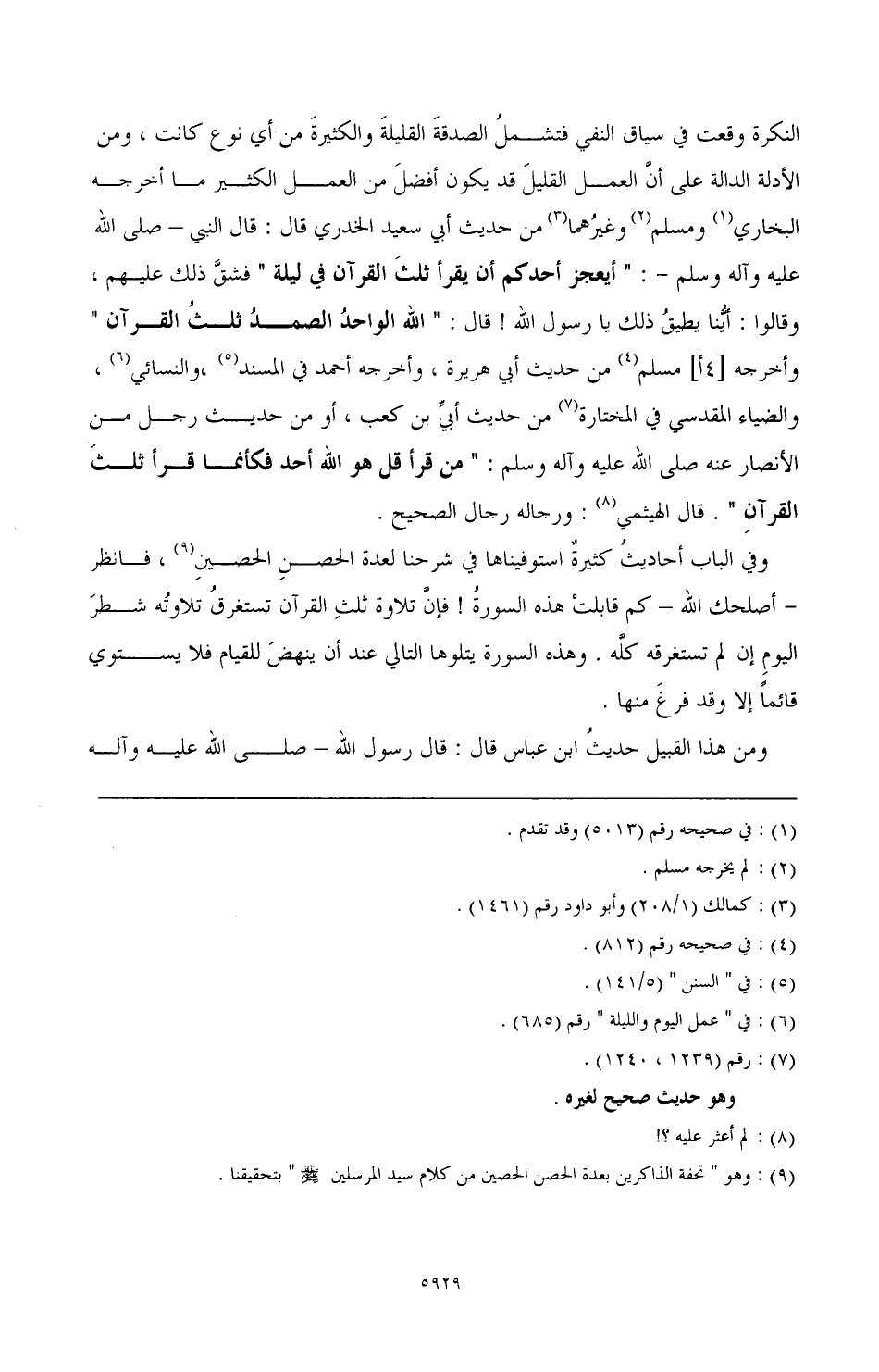 وفي الباب أحاديثُ كثيرةٌ استوفيناها في شرحنا لعدة الحصنِ الحصينِ، (¬9) فانظر ـ أصلحك الله ـ كم قابلتْ هذه السورةُ! فإنَّ تلاوة ثلثِ القرآن تستغرقُ تلاوتُه شطرَ اليومِ إن لم تستغرقه كلَّه. وهذه السورة يتلوها التالي عند أن ينهضَ للقيام فلا يستوي قائمًا إلا وقد فرغَ منها.