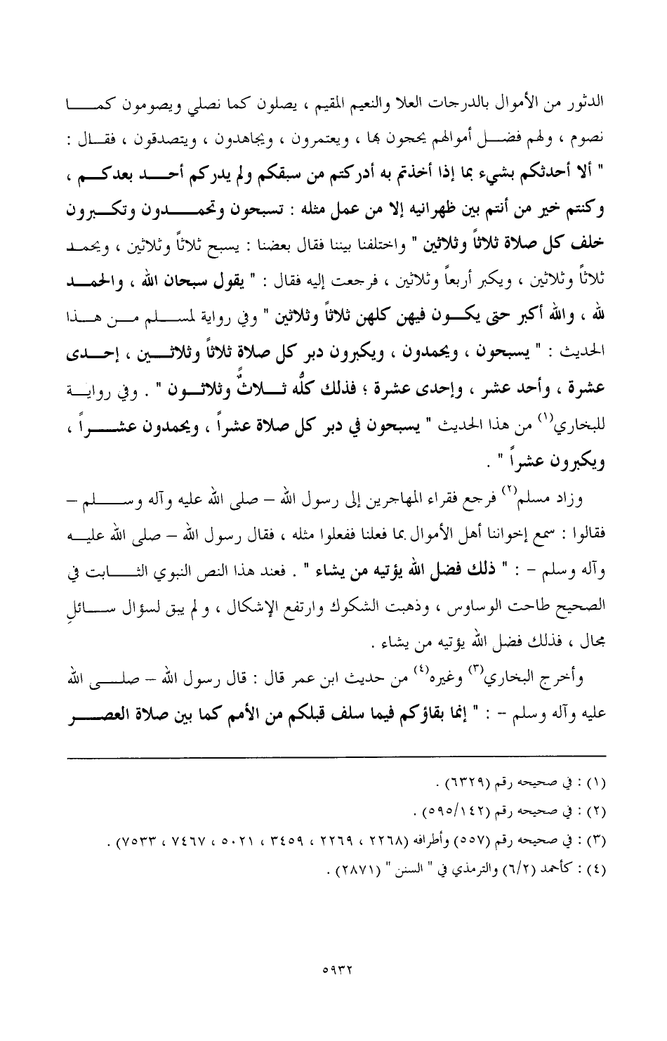 الدثور من الأموال بالدرجات العلا والنعيم المقيم, يصلون كما نصلي ويصومون كما نصوم, ولهم فضل أموالهم يحجون بها, ويعتمرون, ويجاهدون, ويتصدقون, فقال: "ألا أحدثكم بشيء بما إذا أخذتم به أدركتم من سبقكم ولم يدركم أحد بعدكم, وكنتم خير من أنتم بين ظهرانيه إلا من عمل مثله: تسبحون وتحمدون وتكبرون خلف كل صلاة ثلاثًا وثلاثين" واختلفنا بيننا فقال بعضنا: يسبح ثلاثًا وثلاثين, ويحمد ثلاثًا وثلاثين, ويكبر أربعًا وثلاثين, فرجعت إليه فقال: "يقول سبحان الله, والحمد لله, والله أكبر حتى يكون فيهن كلهن ثلاثًا وثلاثين" وفي رواية لمسلم من هذا الحديث: "يسبحون, ويحمدون, ويكبرون دبر كل صلاة ثلاثًا وثلاثين, إحدى عشرة, وإحدى عشر, وإحدى عشرة؛ فذلك كلُّه ثلاثًٌ وثلاثون". وفي رواية للبخاري (¬1) من هذا الحديث "يسبحون في دبر كل صلاة عشرًا, ويحمدون عشرًا, ويكبرون عشرًا".