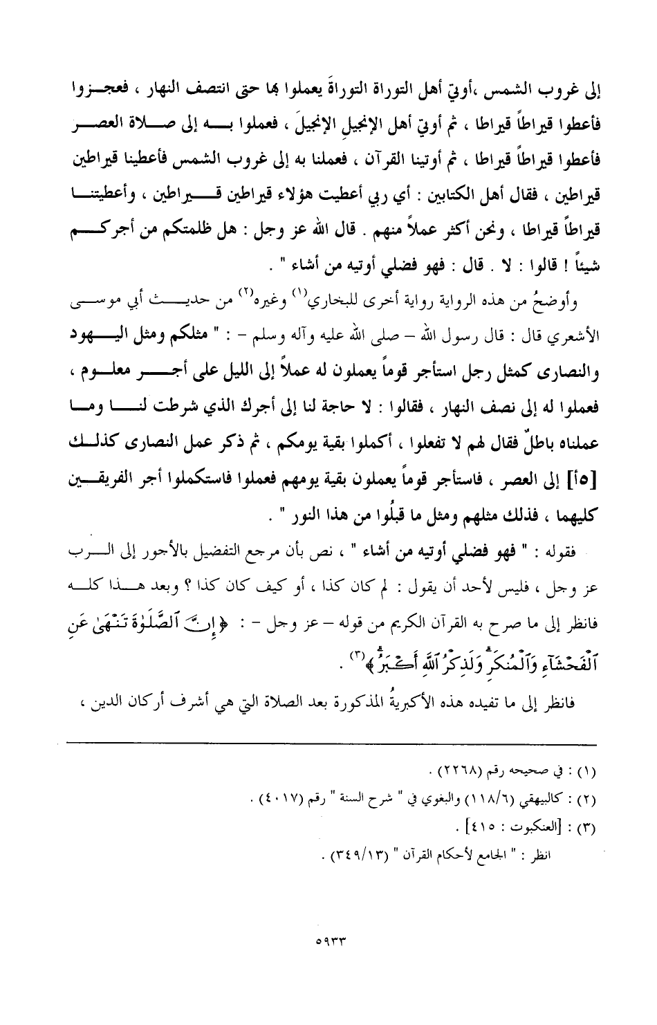 فقوله: "فهو فضلي أوتيه من أشاء", نص بأن مرجع التفضيل بالأجور إلى الرب عز وجل, فليس لأحد أن يقول: لم كان كذا, أو كيف كان كذا؟ وبعد هذا كله فانظر إلى ما صرح به القرآن الكريم من قوله ـ عز وجل ـ: {إِنَّ الصَّلَاةَ تَنْهَى الْفَحْشَاءِ وَالْمُنْكَرِ وَلَذِكْرُ اللَّهِ أَكْبَرُ} (¬3) فانظر إلى ما تفيده هذه الأكبريةُ المذكورة بعد الصلاة التي هى أشرف أركان الدين,