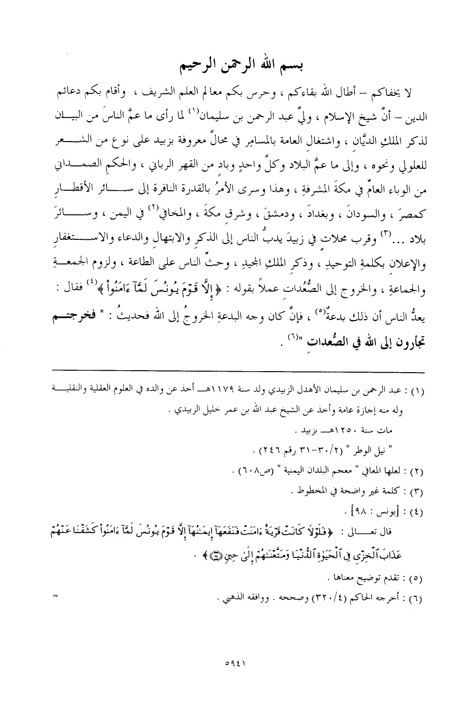 لا يخفاكم ـ أطال الله بقاءكم, وحرس بكم معالم العلم الشريف, وأقام بكم دعائم الدين ـ أن شيخ الإسلام, ولي عبد الرحمن بن سليمان (¬1) لما رأى ما عم الناس من البيان لذكر الملكِ الديَّان, واشتغالِ العامة بالمسامِر في محالَّ معروفة بزبيد على نوع من الشعر للعلولي ونحوه, وإلى ما عم البلاد وكلَّ واحدٍ وباد من القهر الرباني, والحكم الصمداني من الوباء العامِّ في مكةَ المشرفةِ, وهذا وسرى الأمرُ بالقدرة النافرة إلى سائر الأقطار كمصرَ, والسودانَ وبغدادَ, ودمشقَ, وشرق مكةَ, والمخافي (¬2) في اليمن, وسائر بلاد ... (¬3) وقرب محلات في زبيد يدبُّ الناس إلى الذكرِ والابتهال والدعاء والاستغفار والإعلان بكلمة التوحيدِ, وذكرِ الملكِ المجيدِ, وحثِّ الناس على الطاعة, ولزوم الجمعةِ والجماعةِ, والخروج إلى الصُّعُداتِ عملاً بقوله: {إِلَّا قَوْمَ يُونُسَ لَمَّا آمَنُوا} (¬4)
