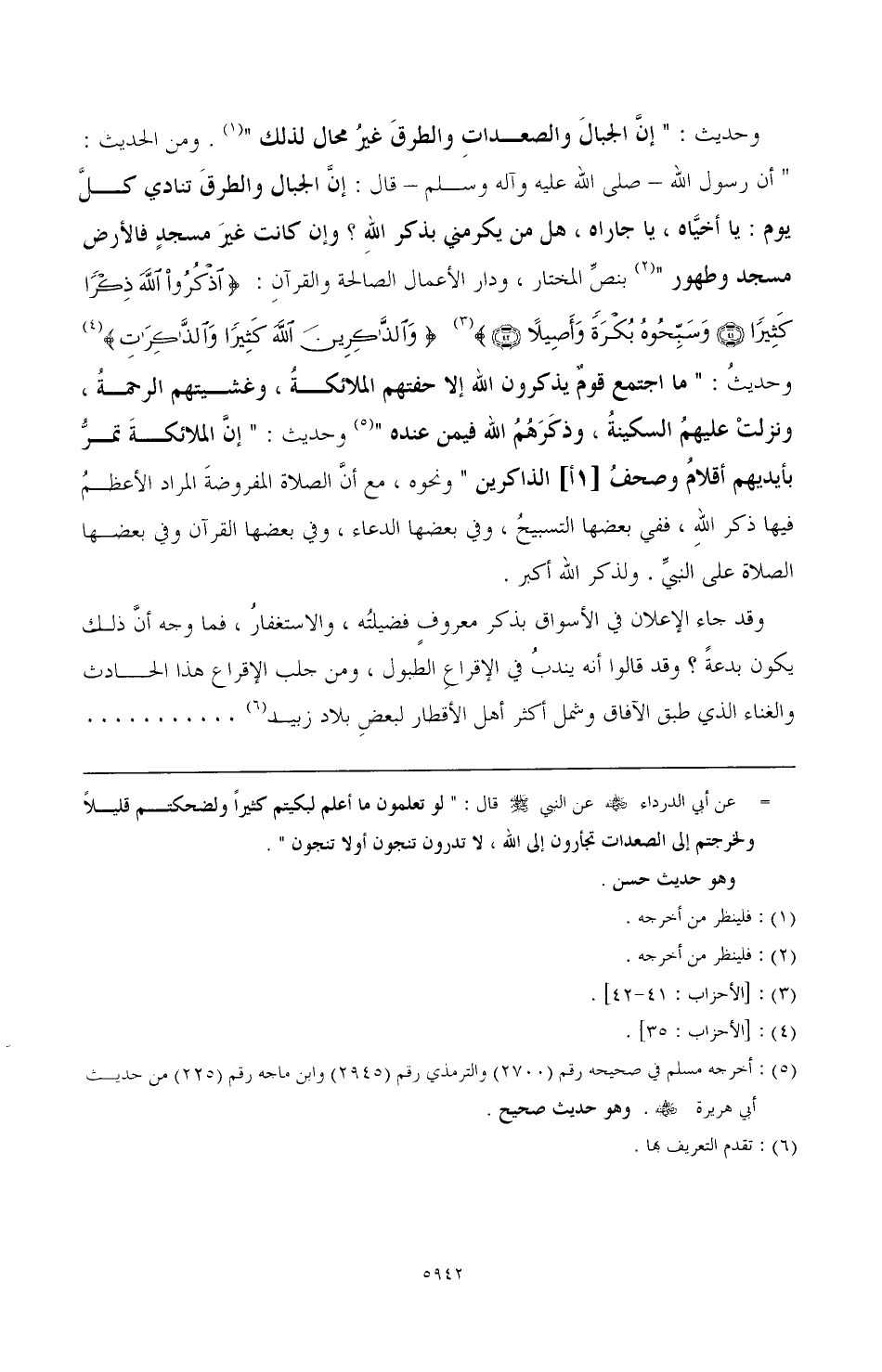 وحديث: ((إنَّ الجبالَ والصعداتِ والطرقَ غيرُ محال لذلك)) (¬1) ومن الحديث: «أن رسول الله ـ صلي الله عليه وسلم ـ قال: إنَّ الجبال والطرقَ تنادي كلَّ يوم: يا أخيَّاه، يا جاراه، هل من يكرمني بذكر اللهِ؟ وإن كانت غيرَ مسجدٍ فالأرض مسجد وطهور» (¬2) بنصِّ المختار، ودار الأعمال الصالحة والقرآنِ: {(يَا أَيُّهَا الَّذِينَ آمَنُوا اذْكُرُوا اللَّهَ ذِكْرًا كَثِيرًا) (وَسَبِّحُوهُ بُكْرَةً وَأَصِيلًا)} (¬3) {وَالذَّاكِرِينَ اللَّهَ كَثِيرًا وَالذَّاكِرَاتِ} (¬4)، وحديثُ: «ما اجتمع قومٌ يذكرون الله إلا حفتهم الملائكةُ، وغشيتهم الرحمةُ، ونزلتْ عليهمُ السكينةُ، وذَكَرَهُمُ الله فيمن عنده» (¬5) وحديث: «إنَّ الملائكةَ تمرُّ بأيديهم أقلامُ وصحفُ [1أ] الذاكرين» ونحوه، مع أنَّ الصلاة المفروضةَ المراد الأعظمُ فيها ذكر الله، ففي بعضها التسبيحُ، وفي بعضها الدعاء، وفي بعضها القرآن وفي بعضها الصلاة على النبيَّ. ولذكر الله أكبر.