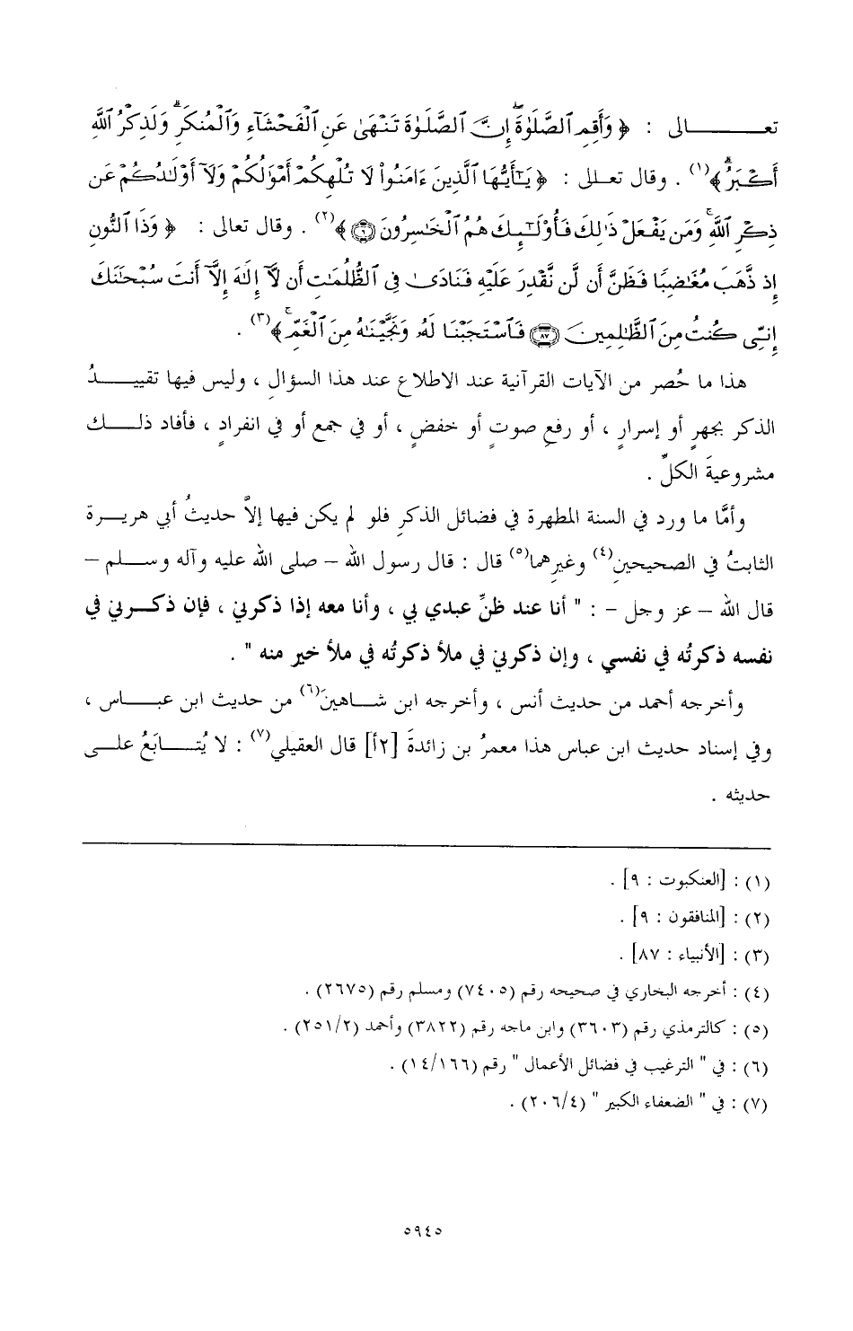 تعالى: {وَأَقِمِ الصَّلَاةَ إِنَّ الصَّلَاةَ تَنْهَى عَنِ الْفَحْشَاءِ وَالْمُنْكَرِ وَلَذِكْرُ اللَّهِ أَكْبَرُ} (¬1). وقال تعالى: {(يَا أَيُّهَا الَّذِينَ آمَنُوا لَا تُلْهِكُمْ أَمْوَالُكُمْ وَلَا أَوْلَادُكُمْ عَنْ ذِكْرِ اللَّهِ وَمَنْ يَفْعَلْ ذَلِكَ فَأُولَئِكَ هُمُ الْخَاسِرُونَ)}. (¬2) وقال تعالى: {(وَذَا النُّونِ إِذْ ذَهَبَ مُغَاضِبًا فَظَنَّ أَنْ لَنْ نَقْدِرَ عَلَيْهِ فَنَادَى فِي الظُّلُمَاتِ أَنْ لَا إِلَهَ إِلَّا أَنْتَ سُبْحَانَكَ إِنِّي كُنْتُ مِنَ الظَّالِمِينَ فَاسْتَجَبْنَا لَهُ وَنَجَّيْنَاهُ مِنَ الْغَمِّ} (¬3).