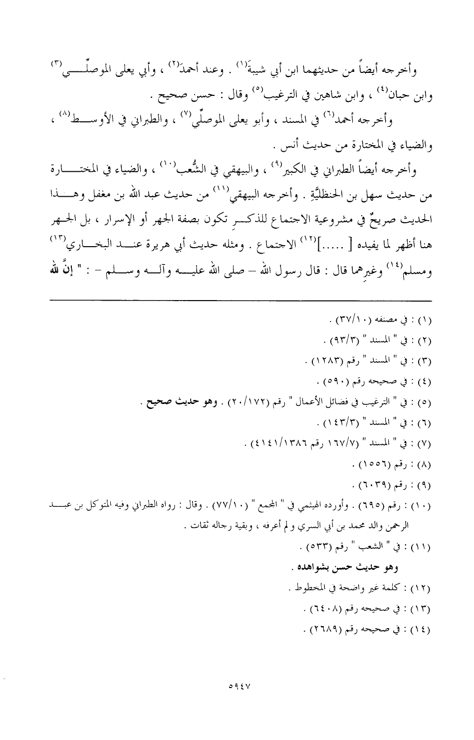 وأخرجه أيضًا الطبراني في الكبير (¬9)، والبيهقي في الشُّعب (¬10) والضياء في المختارة من حديث سهل بن الحنظليَّةِ. وأخرجه البيهقي (¬11) من حديث عبد الله بن مغفل وهذا الحديث صريحٌ في مشروعية الاجتماع للذكر تكون بصفة الجهر أو الإسرار، بل الجهر هنا أظهر لما يفيده [ ..... ] (¬12) الاجتماع. ومثله حديث أبي هريرة عند البخاري (¬13) ومسلم (¬14) وغيرِهما قال: قال رسول الله ـ صَلَّى اللهُ عَلَيْهِ وَآلِهِ وَسَلَّمَ ـ: «إنَّ لله