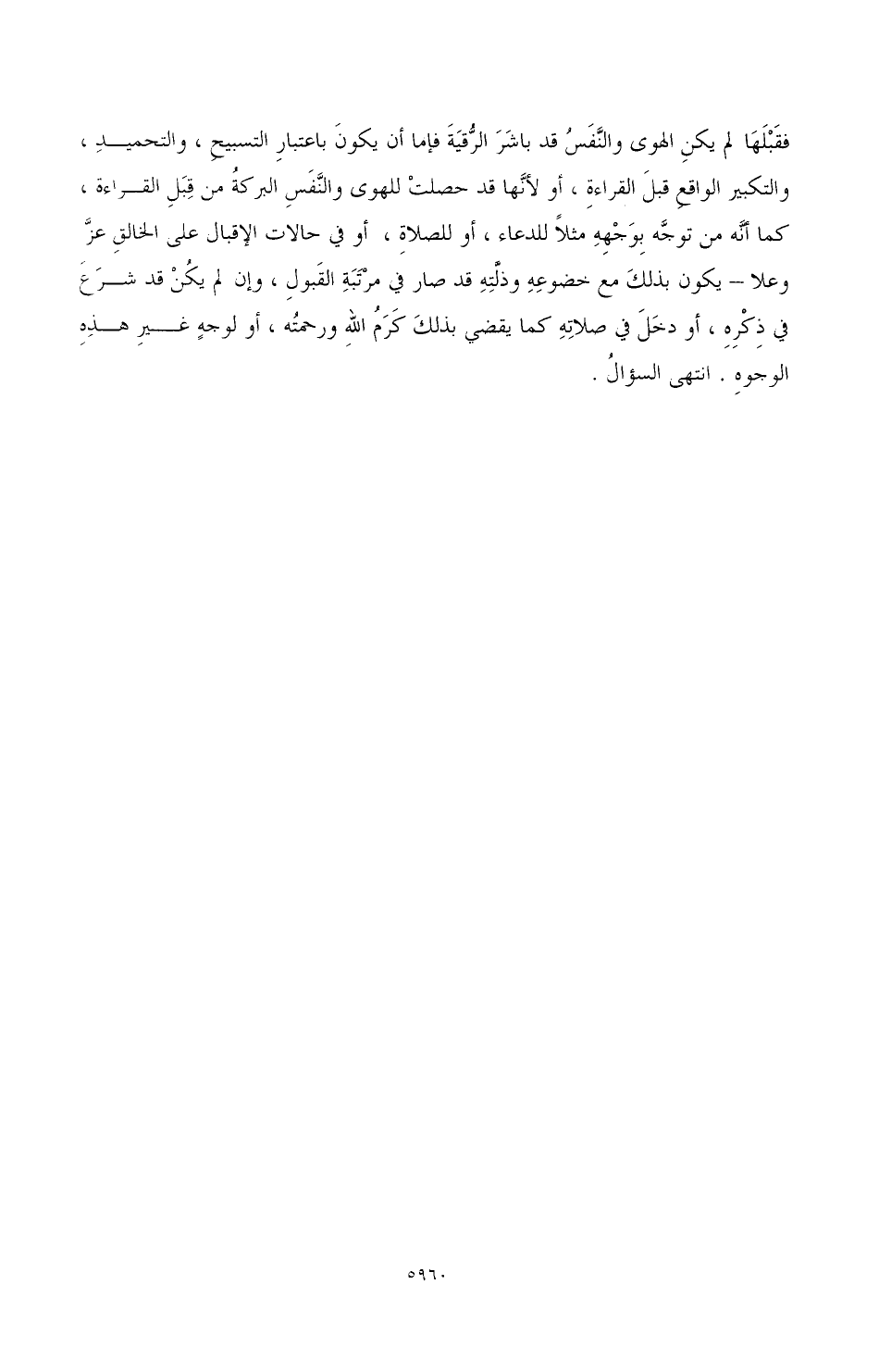 فقَبْلَهَا لم يكن الهوى والنَّفَسُ قد باشَرَ الرُّقيَة فأما أن يكونَ باعتبارِ التسبيحِ, والتحميدِ, والتكبير الواقع قبل القراءةِ, أو لأنَّها قد حصلتْ للهوى والنَّفَسِ البركةُ من قِبَلِ القراءة, كما أنَّه من توجَّه بوَجْهِهِ مثلاً للدعاء, أو للصلاةِ, أو في حالات الإقبال على الخالقِ عزَّ وعلا ـ يكون بذلكَ مع خضوعِهِ وذلَّتِهِ قد صار في مرْتَبةِ القَبولِ, وإن لم يكُنْ قد شرَعَ في ذِكْرِهِ, أو دخَلَ في صلاتهِ كما يقضي بذلكَ كَرَمُ الله ورحمتُه, أو لوجهٍ غيرِ هذِهِ الوجوهِ. انتهى السؤالُ.
