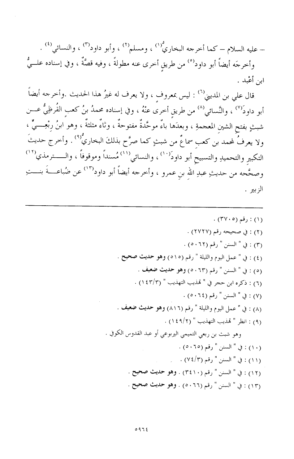 قال علي بن المديني: (¬6) ليس بمعروفٍ, ولا يعرف له غيرهُ هذا الحديث. وأخرجه أيضًا أبو داودَ, (¬7) والنسائي (¬8) من طريق أخرى عنهُ, وفي إسناده محمدُ بنُ كعبٍ القُرظِيُّ عن شبثٍ بفتحِ الشينِ المعجمةِ, وبعدَها باءٌ موحَّدةٌ مفتوحةٌ, وثاءٌ مثلثةٌ, وهو ابنُ رِبْعِيٍّ, ولا يعرفُ لمحمد بن كعبِ سماعٌ من شبثٍ كما صرَّح بذلكَ البخاريُّ. (¬9) وأخرج حديثَ التكبيرِ والتحميدِ والتسبيحِ أبو داودَ, (¬10) والنسائي (¬11) مسندًا وموقوفًا, والترمذي (¬12) وصحَّحه من حديثِ عبدِ اللهِ بنِ عمرو, وأخرجه أيضًا أبو داود (¬13) عن ضُباعةَ بنتِ الزبير.