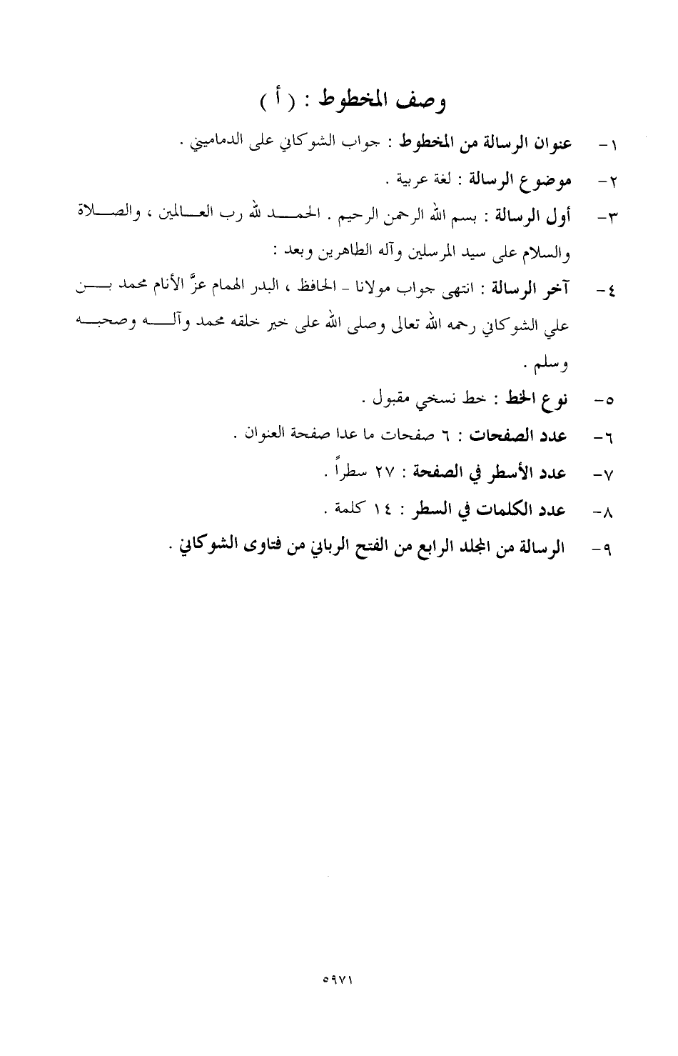 4 ـ آخر الرسالة: انتهى جواب مولانا ـ الحافظ, البدر الهمام عزَّ الأنام محمد بن علي الشوكاني رحمه الله تعالى وصلى الله على خير خلقه محمد وآله وصحبه وسلم.
