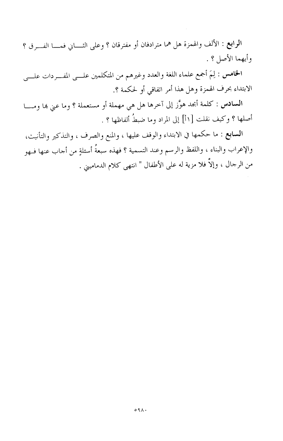 السابع: ما حكمها في الابتداء والوقف عليها، والمنع والصرف، والتذكير والتأنيث، والإعراب والبناء، واللفظ والرسم وعند التسمية؟ فهذه سبعةُ أسئلةٍ من أجاب عنها فهو من الرجال، وإلا فلا مزية له على الأطفال) انتهى كلام الدماميني.