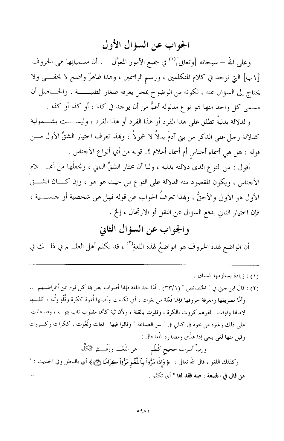 وعلى الله ـ سبحانه [وتعالى] (¬1) في جميع الأمور المعوَّل ـ أن مسمياتِها هي الحروف [1ب] التي توجد في كلام المتكلمين، ورسمِ الراسمين، وهذا ظاهرٌ واضح لا يخفى ولا يحتاج إلى السؤال عنه، لكونه من الوضوح بمحل يعرفه صغار الطلبة. والحاصل أن مسمى كل واحد منها هو نوع مدلوله أعمُّ من أن يوجد في كذا، أو كذا أو كذا.