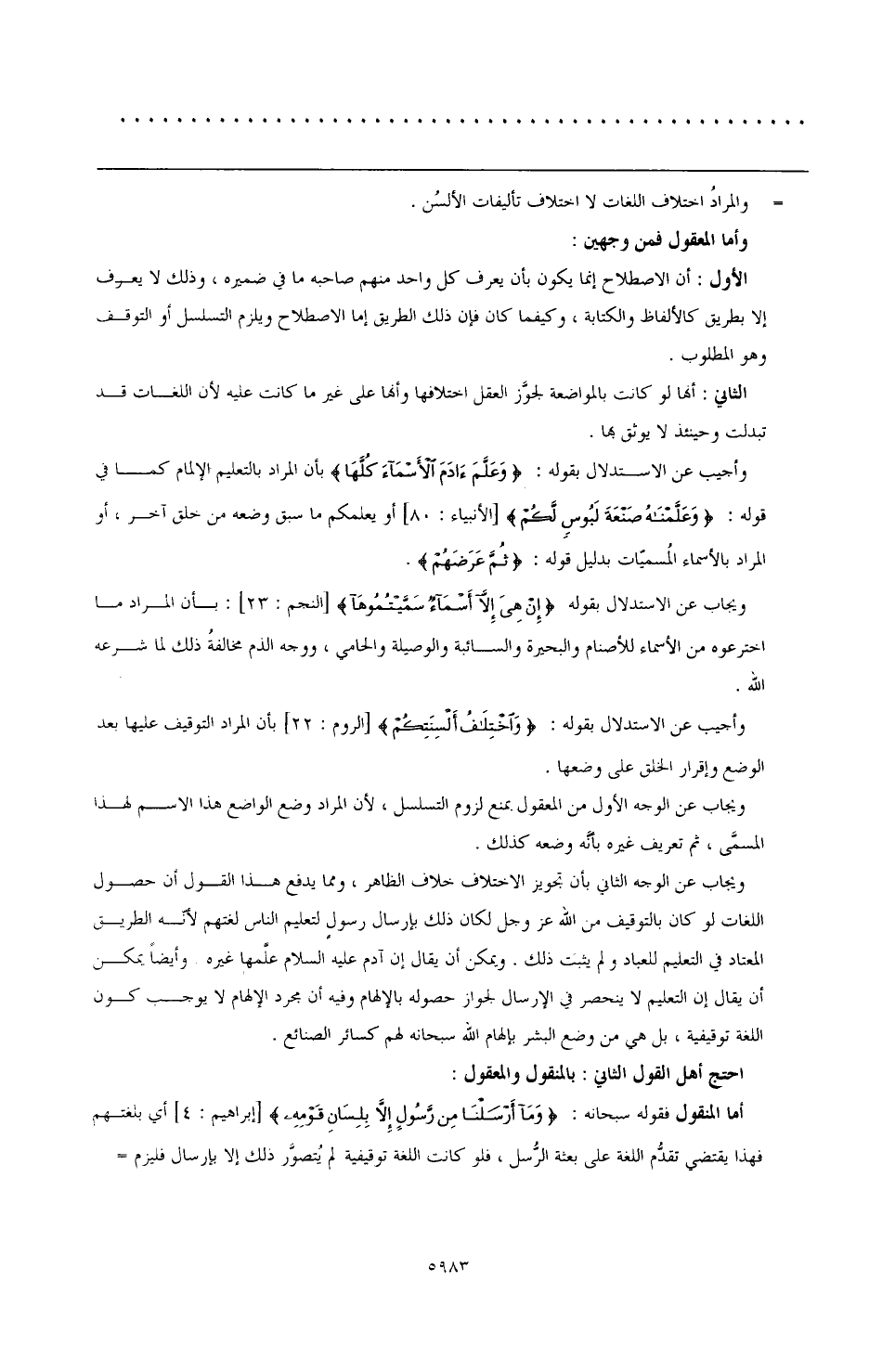 ويجاب عن الوجه الثاني بأن تجويز الاختلاف خلاف الظاهر, ومما يدفع هذا القول أن حصول اللغات لو كان بالتوقيف من الله عز وجل لكان ذلك بإرسال رسول لتعليم الناس لغتهم لأنه الطريق المعتاد في التعليم للعباد ولم يثبت ذلك. ويمكن أن يقال إن آدم عليه السلام علَّمها غيره وأيضًا يمكن أن يقال إن التعليم لا ينحصر في الإرسال لجواز حصوله بالإلهام وفيه أن مجرد الإلهام لا يوجب كون اللغة توقيفية, بل هى من وضع البشر بإلهام الله سبحانه لهم كسائر الصنائع.