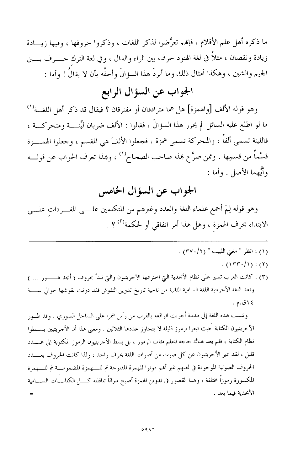 وهو قوله لِمَ أجمع العلماء اللغة والعدد وغيرهم من المتكلمين على المفرداتِ على الابتداء بحرف الهمزةِ, وهل هذا أمر اتفاقي أو الحكمة؟ (¬3)
