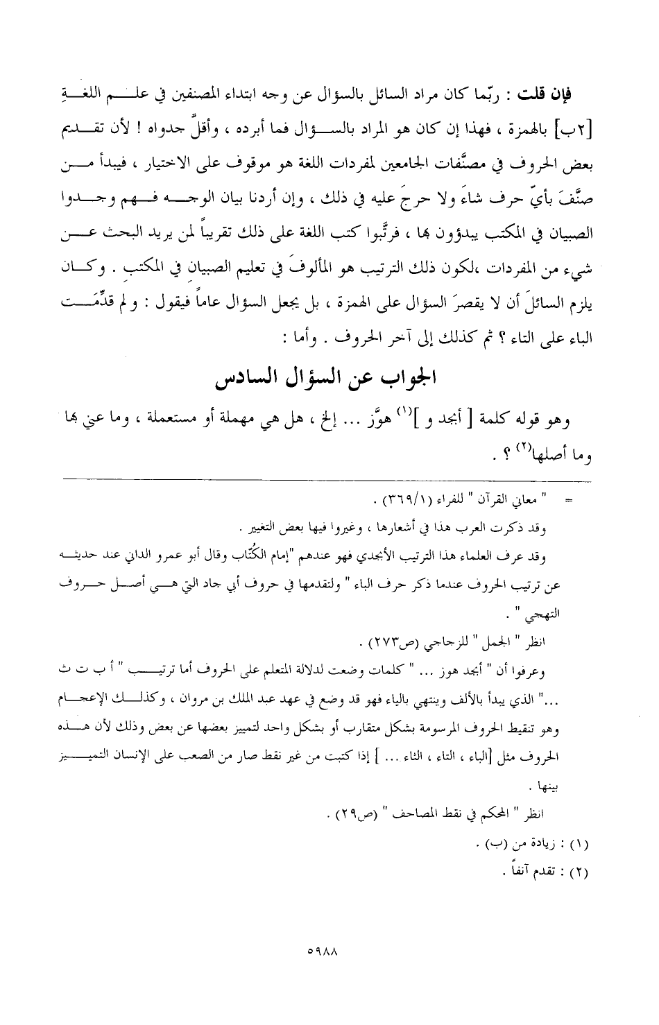 فإن قلت: ربّما كان مراد السائل بالسؤال عن وجه ابتداء المصنفين في علم اللغةِ [2ب] بالهمزة، فهذا إن كان هو المراد بالسؤال فما أبرده، وأقلَّ جدواه! لأن تقديم بعض الحروف في مصنَّفات الجامعين لمفردات اللغة هو موقوف على الاختيار، فيبدأ من صنَّف بأيّ حرف شاءَ ولا حرجَ عليه في ذلك، وإن أردنا بيان الوجه فهم وجدوا الصبيان في المكتب يبدؤون بها، فرتَّبوا كتب اللغة على ذلك تقريبًا لمن يريد البحث عن شيء من المفردات، لكون ذلك الترتيب هو المألوفَ في تعليم الصبيانِ في المكتبِ. وكان يلزم السائلَ أن لا يقصرَ السؤال على الهمزة، بل يجعل السؤال عامًا فيقول: ولم قدِّمَت الباء على التاء؟ ثم كذلك إلي آخر الحروف. وأما: