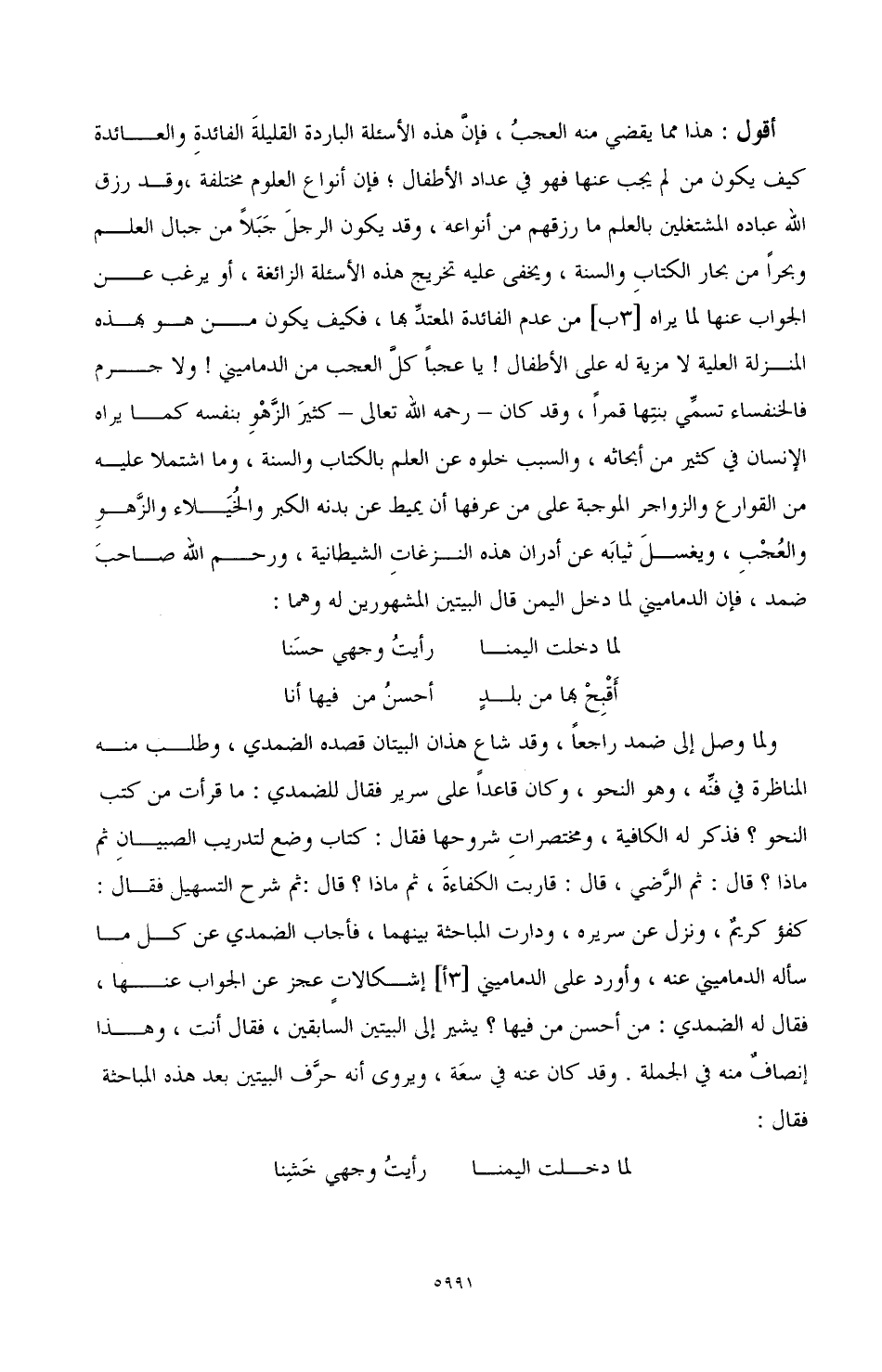 أقول: هذا مما يقضي منه العجبُ، فإنَّ هذه الأسئلة الباردة القليلةَ الفائدةِ والعائدة كيف يكون من لم يجب عنها فهو في عداد الأطفال، فإن أنواع العلوم مختلفة، وقد رزق الله عباده المشتغلين بالعلم ما رزقهم من أنواعه، وقد يكون الرجلَ جَبَلاً من جبال العلم وبحرًا من بحار الكتابِ والسنة، ويخفي عليه تخريج هذه الأسئلة الزائغة، أو يرغب عن الجواب عنها لما يراه [3ب] من عدم الفائدة المعتدِّ بها، فكيف يكون من هو بهذه المنزلة العلية لا مزية له على الأطفال! يا عجبًا كلَّ العجب من الدماميني! ولا جرم فالخنفساء تسمِّي بنتِها قمرًا، وقد كان ـ رحمه الله تعالى ـ كثيرَ الزَّهْوِ بنفسه كما يراه الإنسان في كثير من أبحاثه، والسبب خلوه عن العلم بالكتاب والسنة، وما اشتملا عليه من القوارع والزواجر الموجبة على من عرفها أن يميط عن بدنه الكبر والخُيَلاء والزَّهوِ والعُجْبِ، ويغسلَ ثيابَه عن أدران هذه النزغاتِ الشيطانية، ورحم الله صاحبَ ضمد، فإن الدماميني لما دخل اليمن قال البيتين المشهورين له وهما: