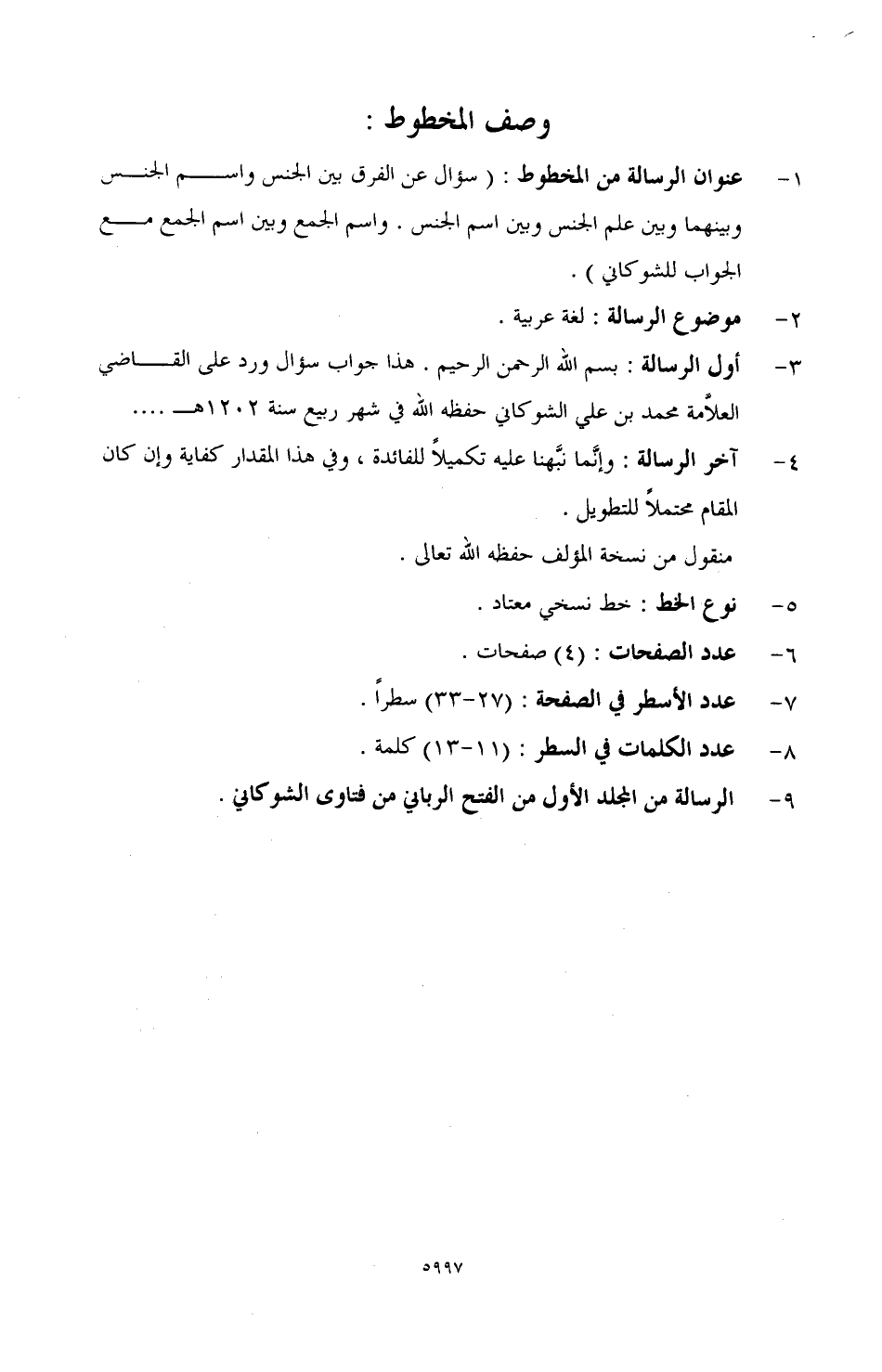 1 ـ عنوان الرسالة من المخطوط: (سؤال عن الفرق بين الجنس واسم الجنس وبينهما وبين علم الجنس وبين اسم الجنس. واسم الجمع وبين اسم الجمع مع الجواب للشوكاني).