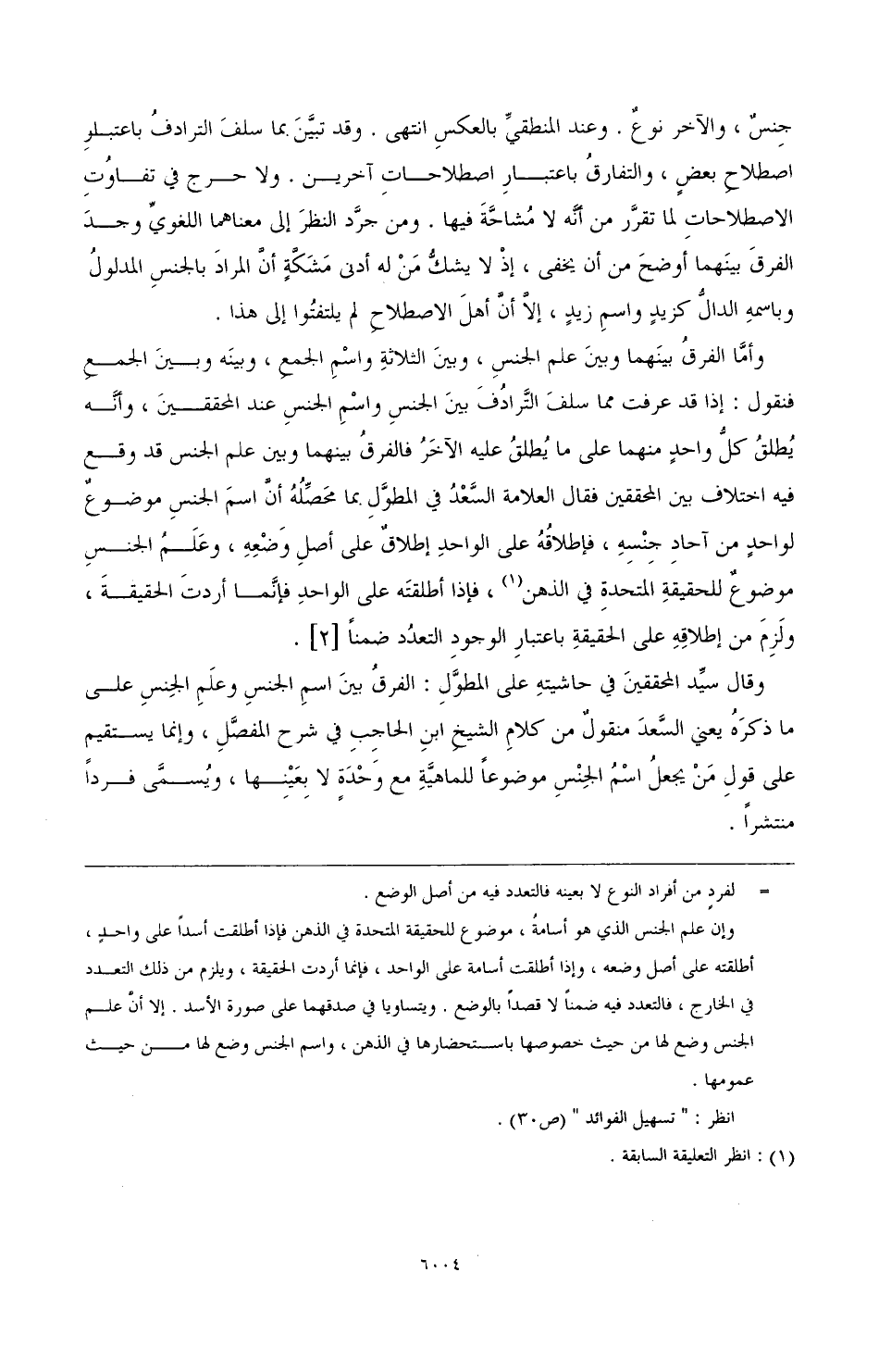 جنسٌ, والآخر نوعٌ, وعند المنطقيِّ بالعكس انتهى. وقد تبيَّنَ بما سلفَ الترادفُ باعتبارِ اصطلاحِ بعضٍ, والتفارقُ باعتبارِ اصطلاحاتِ آخرين. ولا حرج في تفاوُتِ الاصطلاحاتِ لما تقرَّر من أنَّه لا مُُشاحَّةَ فيها. ومن جرَّد النظرَ إلى معناهما اللغويِّ وجدَ الفرقَ بينَهما أوضح من أن يخفى, إذ لا يشكُّ مَنْ له أدنى مَشَكَّةٍ أنَّ المرادَ بالجنسِ المدلولُ وباسمهِ الدالُّ كزيدٍ واسمِ زيدٍ, إلا أنَّ أهلَ الاصطلاحِ لم يلتفتُوا إلى هذا.