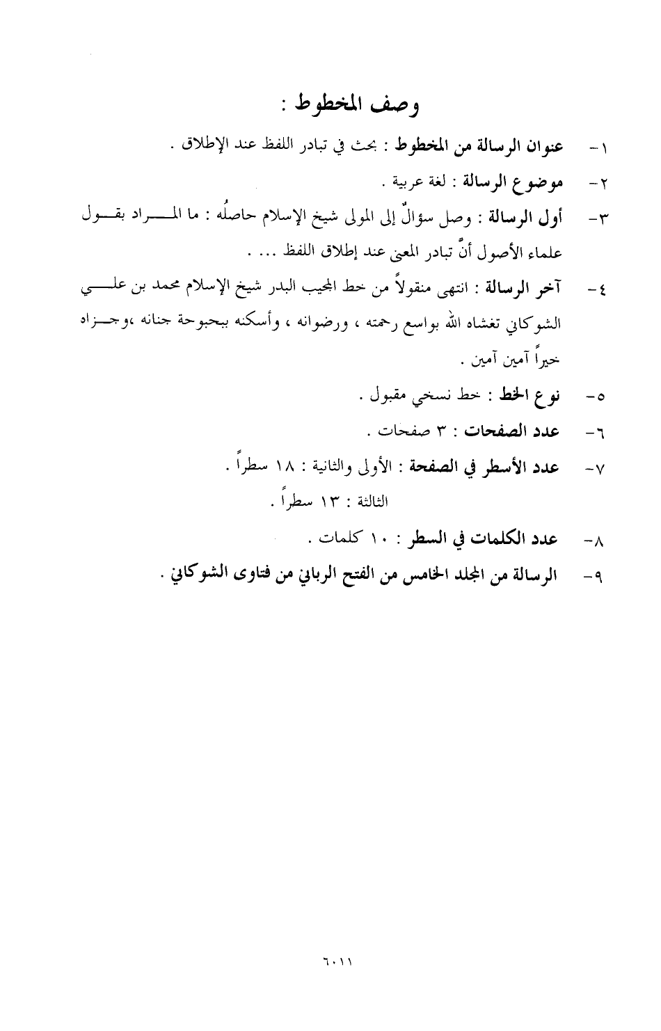 4 ـ آخر الرسالة: انتهى منقولاً من خط المجيب البدر شيخ الإسلام محمد بن علي الشوكاني تغشاه الله بواسع رحمته، ورضوانه، وأسكنه ببحبوحة جنانه، وجزاه خيرًا آمين آمين.
