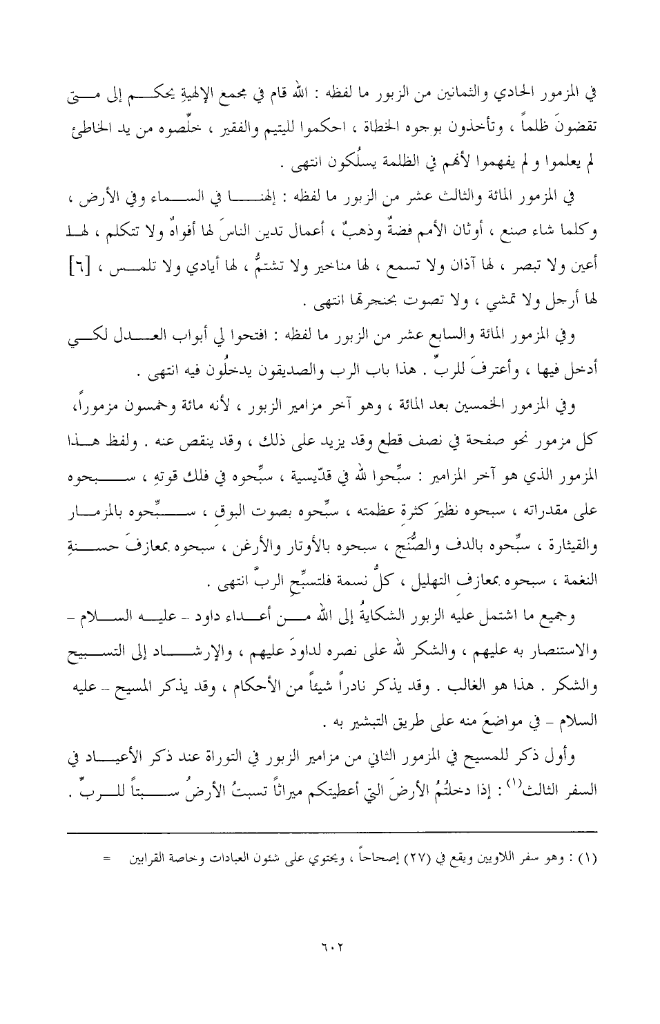 وجميع ما اشتمل عليه الزبور الشكاية إلى الله من أعداء داود- عليه السلام- والاستنصار به عليهم، والشكر لله على نصره لداود عليهم، والإرشاد إلى التسبيح والشكر. هذا هو الغالب. وقد يذكر نادرا شيئا من الأحكام، وقد يذكر المسيح- عليه السلام- في مواضع منه على طريق التبشير به.