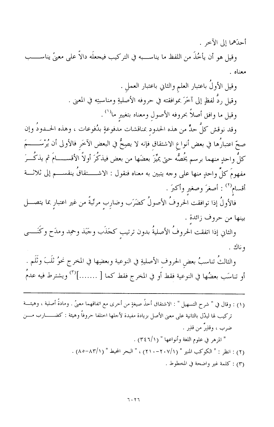 وقد نوقش كلُّ حدٍّ من هذه الحدودِ بمناقشات مدفوعةٍ بدُفوعات، وهذه الحدودُ وإن صحّ اعتبارُها في بعض أنواعِ الاشتقاقِ فإنه لا يصِحُّ في البعض الآخَرِ فالأولى أن يُرْسَمَ كلُّ واحدٍ منهما برسم يُخصُّه حتى يميِّزَ بعضَها من بعض فيذكُرَ أولاً الأقسامَ ثم يذكُرَ مفهومَ كلِّ واحدٍ منها على وجه يتبين به معناه فنقول: الاشتقاقُ ينقسم إلى ثلاثة أقسامٍ (¬2): أصغرَ وصغيرٍ وأكبرَ.