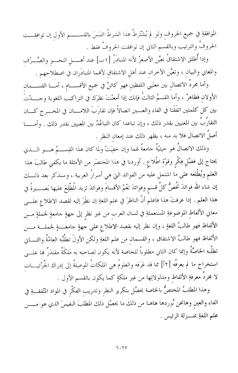 وذلك الاتصالُ هو حيثيّةٌ جامعةٌ لهما وإن خفِيَتْ ولما كان هذا القِسمُ هو الذي يحتاج إلى فضْلِ فِكْرٍ وقوّةِ اطّلاعٍ. أوردنا في هذا المختصَر من الأمثلة ما يكفي طالبَ هذا العلمِ ويُطْلعه على ما اشتمل عليه من الفوائد التي هى أسرارُ العربية, وسنذكر بعد ذلك إن شاء الله فوائد تُخصُّ كلَّ قسمٍ وفوائدَ تعُمّ الأقسامَ وفوائدَ تزيد المُطَّلِعَ عليها بَصيرةً في هذا العلم. إذا عرفتَ هذا فاعلم أنّ الناظرَ في علم اللغةِ إن نظَرَ إليه لقصد الاطلاعِ علي معاني الألفاظِ الموضوعةِ المستعملةِ في لسان العربِ من غير نظرٍ إلى جهةٍ جامعة لجملة من الألفاظ فهو طالبُ الاشتقاق، والقسمانِ علم اللغةِ ولكن الأولَ تطلُبُه العامّةُ والثاني تطلُبه الخاصَّةُ وإنما كان الثاني مطلوبًا للخاصة لأنه يكون لصاحبه به مَلكَةٌ مقتدَرٌ بها علي استخراج ما لم يعرِفْه [2أ] مما قد عَرَفه والعلومُ هي الملكاتُ الموصِلةُ إلى إدراك الجُزْئياتِ لا مجردُ معرفةِ الألفاظِ ومدلولاتِها من غير ملكةٍ كما يكون بالقسم الأول.
