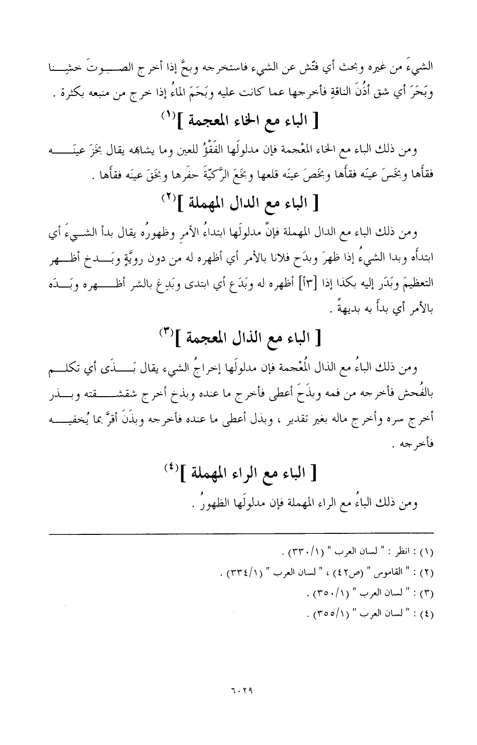 ومن ذلك الباء مع الدال المهملة فإنَّ مدلولَها ابتداءُ الأمرِ وظهورُه يقال بدأ الشيءَ أي ابتدأَه وبدا الشيءُ إذا ظهرَ وبدَح فلانًا بالأمر أي أظهره له من دون رويَّةٍ وبَدخَ أظهر التعظيمَ وبَدبَر إليه بكذا إذا [3أ] أظهره له وبَدَع أي ابتدى وبَدِغ بالشر أظهره وبَدَه بالأمر أي بدأ به بديهةً.