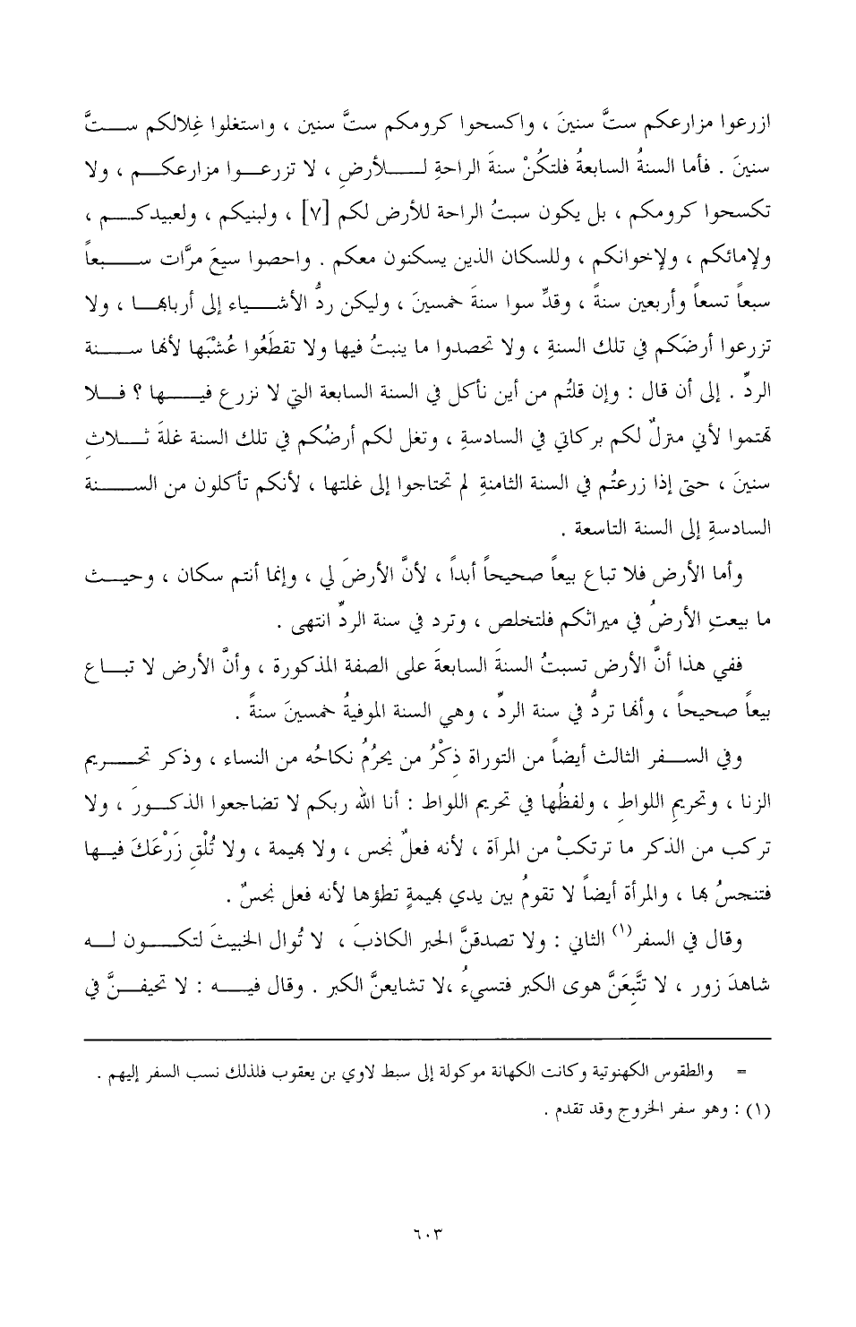 ازرعوا مزارعكم ست سنين، واكسحوا كرومكم ست سنين، واستغلوا غلالكم ست سنين. فأما السنة السابعة فلتكن سنة الراحة للأرض، لا تزرعوا مزارعكم، ولا تكسحوا كرومكم، بل يكون سبت الراحة للأرض لكم [7]، ولبنيكم، ولعبيدكم، ولإمائكم، ولإخوانكم، وللسكان الذين يسكنون معكم. واحصوا سبع مرات سبعا سبعا تسعا وأربعين سنة، وقد سوا سنة خمسين، وليكن رد الأشياء إلى أرباها، ولا تزرعوا أرضكم في تلك السنة، ولا تحصدوا ما ينبت فيها ولا تقطعوا عشبها لأنها سنة الرد. إلى أن قال: وإن قلتم من أين نأكل في السنة السابعة التي لا نزرع فيها؟ فلا تهتموا لأني منزل لكم بركاتي في السادسة، وتغل لكم أرضكم في تلك السنة غلة ثلاث سنين، حتى إذا زرعتم في السنة الثامنة لم تحتاجوا إلى غلتها، لأنكم تأكلون من السنة السادسة إلى السنة التاسعة.
