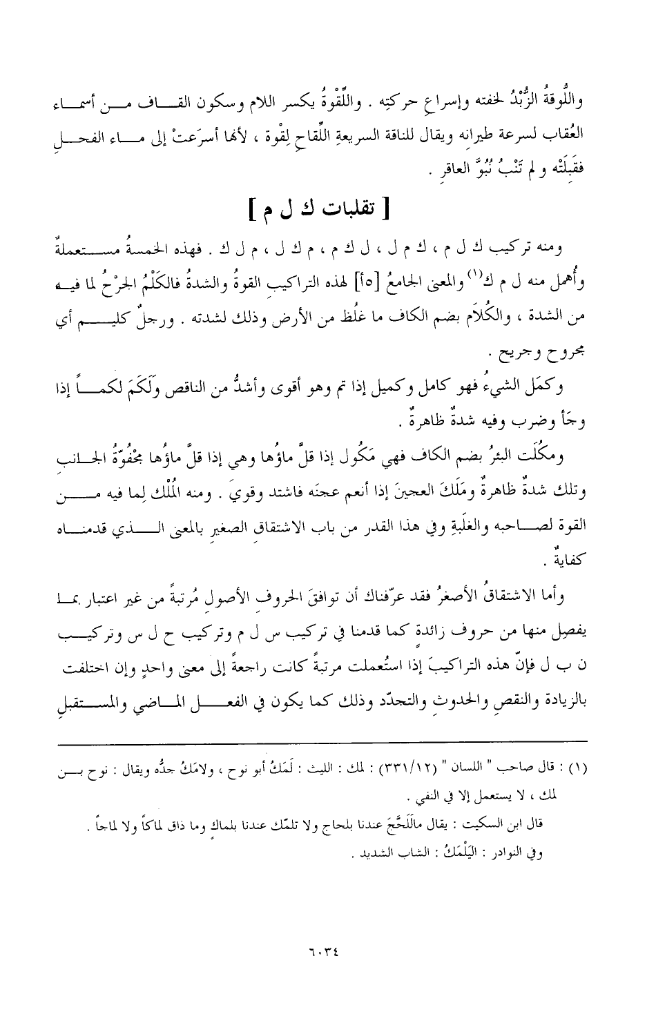 ومنه تركيب ك ل م، ك م ل، ل ك م، م ك ل، م ل ك. فهذه الخمسةُ مستعملةُ وأُهمل منه ل م ك (¬1) المعنى الجامعُ [5أ] لهذه التراكيبِ القوةُ والشدةُ فالكَلْمُ الجرْحُ لما فيه من الشدة، والكُلاَم بضم الكاف ما غلُظ من الأرض وذلك لشدته. ورجلٌ كليم أي مجروح وجريح.
